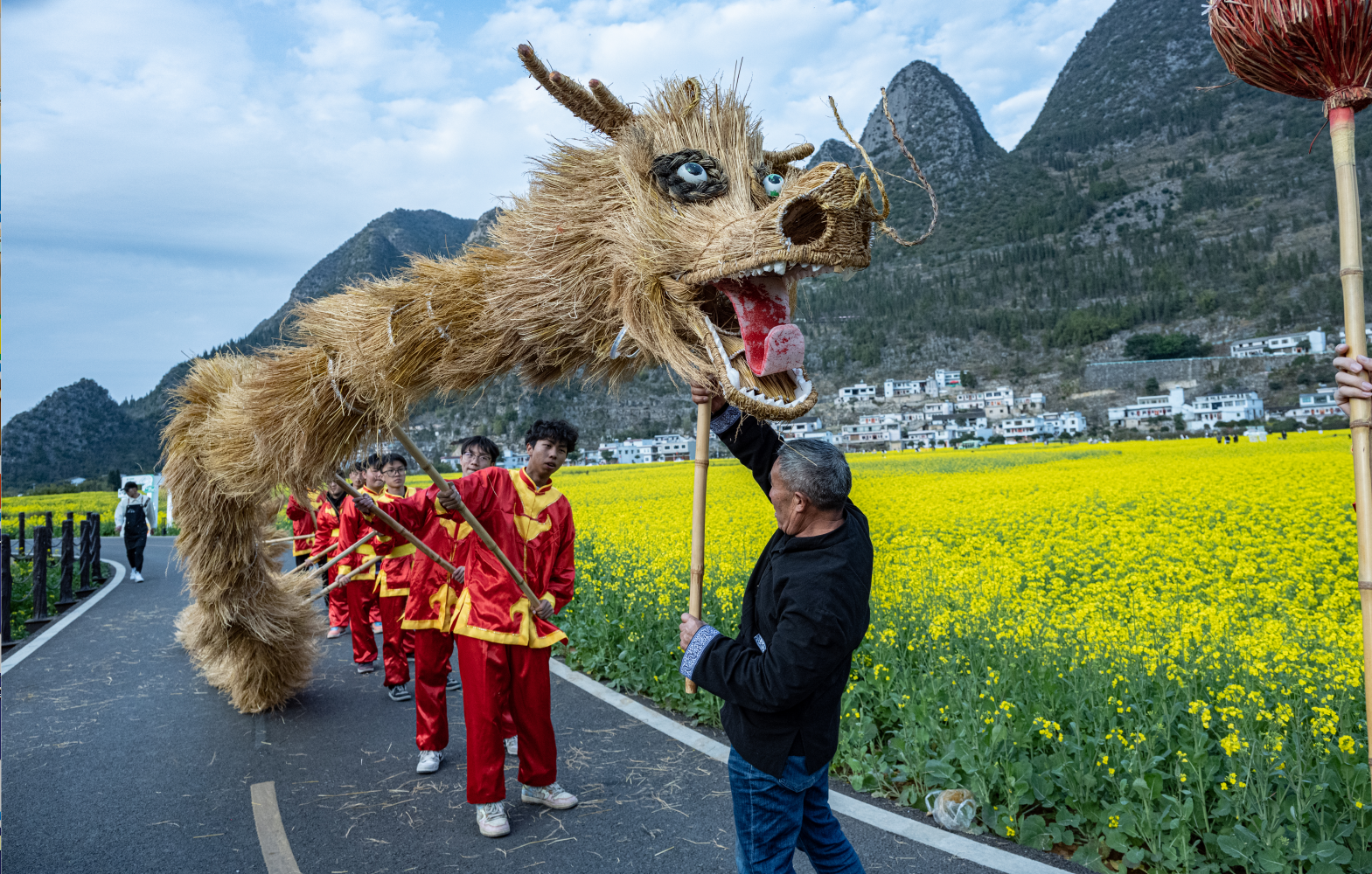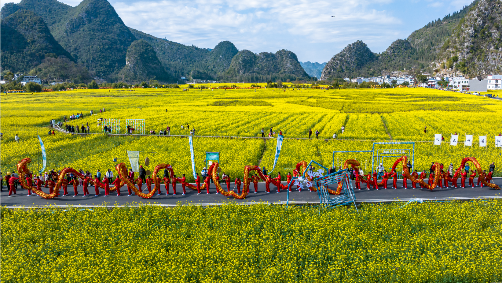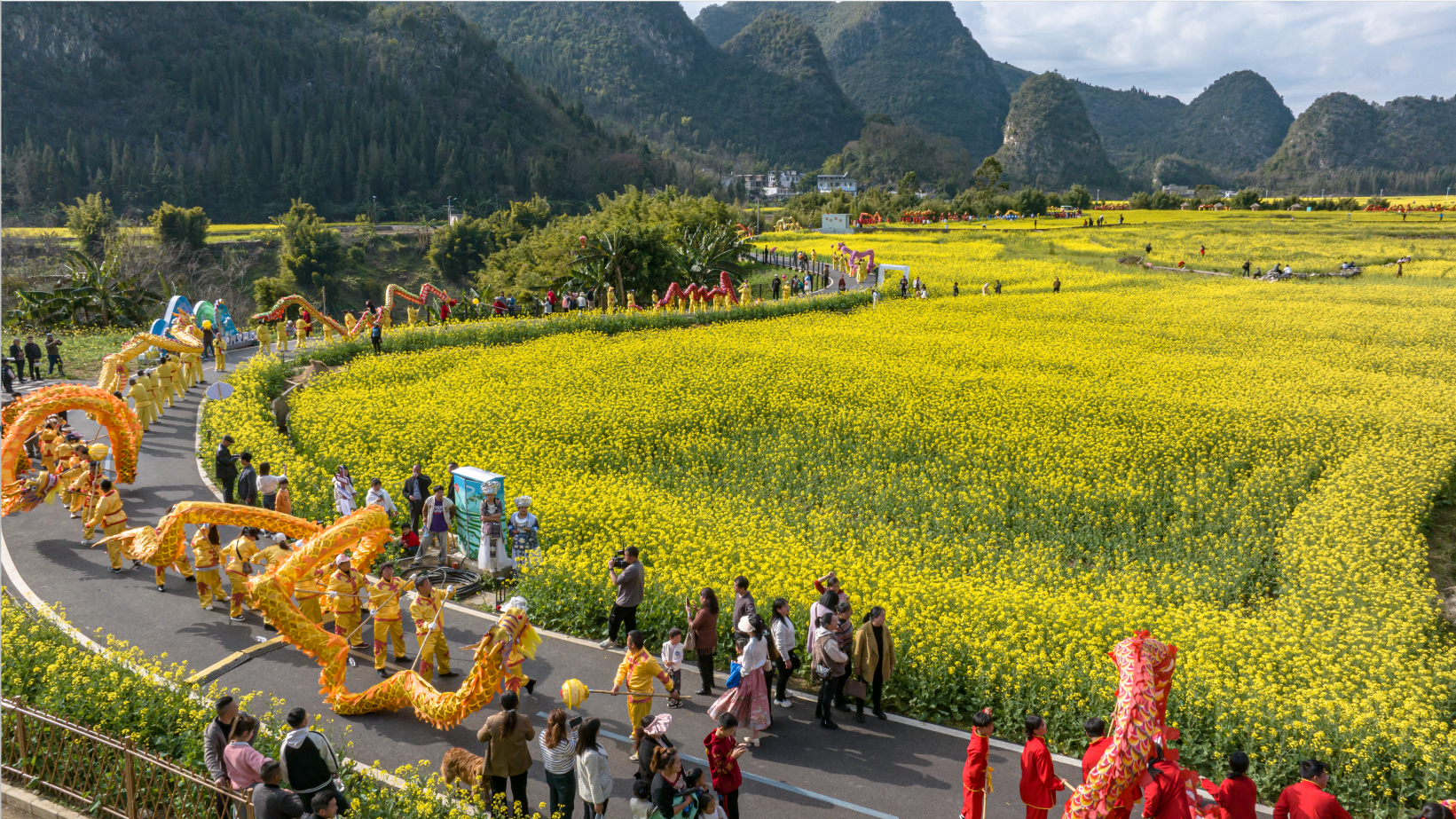 眼下,“万峰成林处·金龙闹新春”2024群众舞龙系列活动正在贵州兴义万峰林风景区成片的油菜花海里精彩上演,福字田旁、将军峰广场、乡愁集市等纳灰河生态产业长廊沿线开展集中巡游、重点区域巡游展演,吸引了大量游客和当地群众前来纳福打卡。活动将持续到正月十五元宵节。