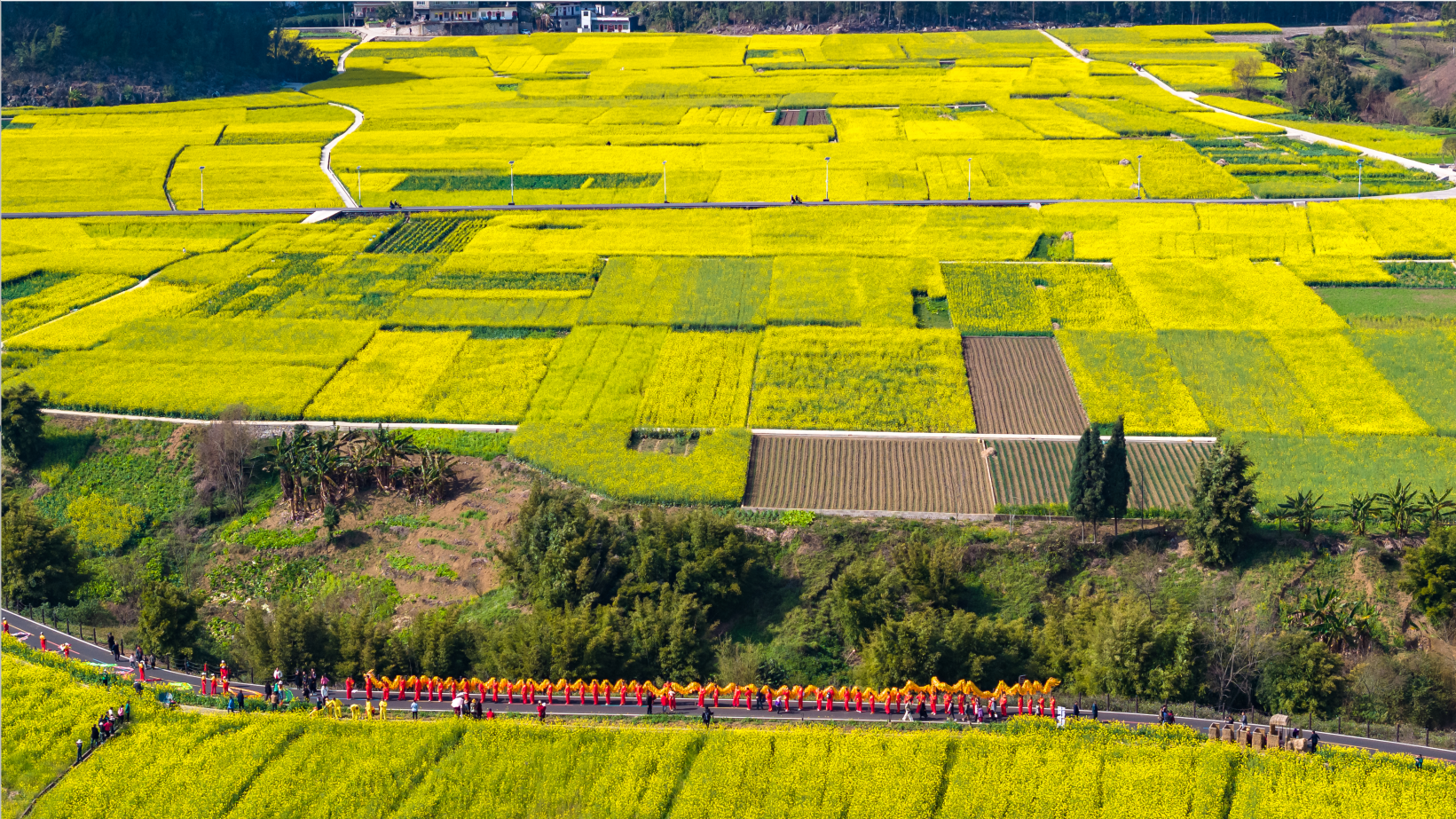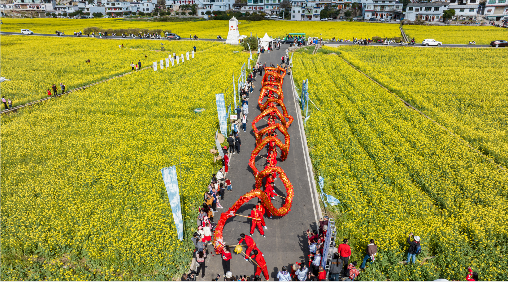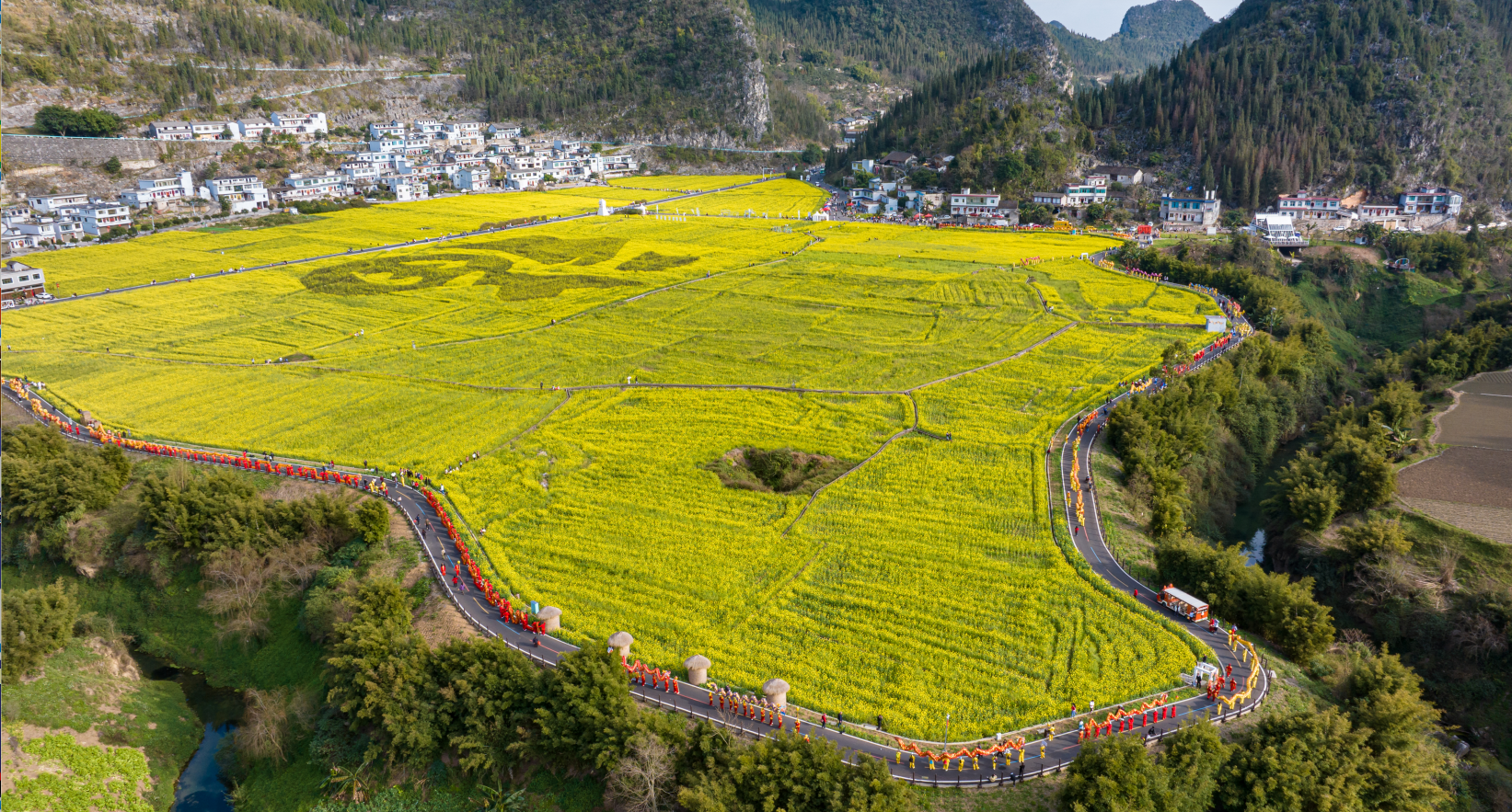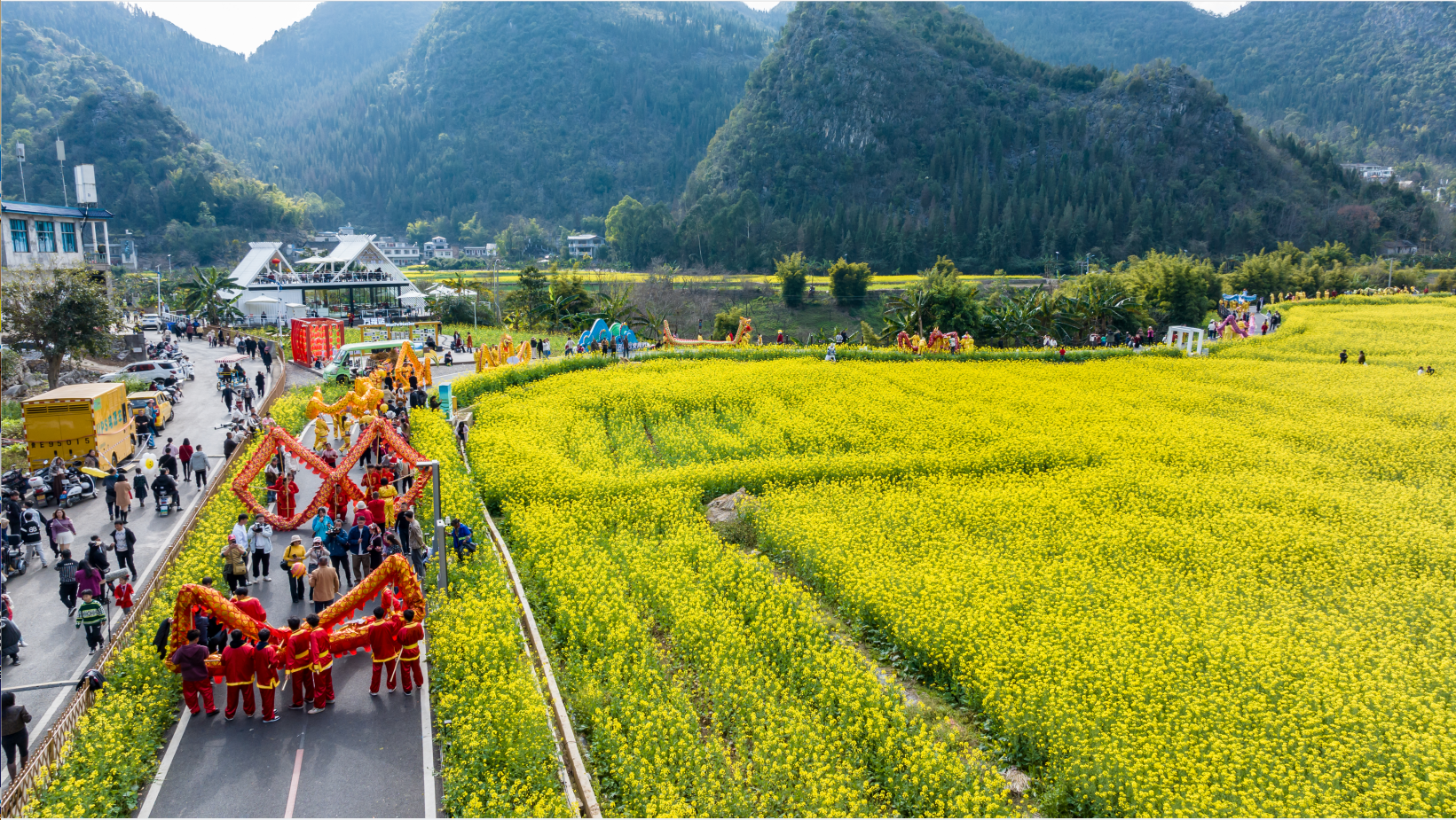 眼下,“万峰成林处·金龙闹新春”2024群众舞龙系列活动正在贵州兴义万峰林风景区成片的油菜花海里精彩上演,福字田旁、将军峰广场、乡愁集市等纳灰河生态产业长廊沿线开展集中巡游、重点区域巡游展演,吸引了大量游客和当地群众前来纳福打卡。活动将持续到正月十五元宵节。