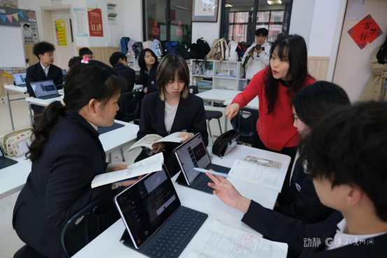 “的确,AI课堂让我们实现了‘千人千面’教学,学生平板端的学习进度、准确率会实时反馈,老师可针对性提示复习,精准适配不同学习节奏,有AI伴读,老师更多是聚焦引导与讲解,同时兼顾AI赋能与中考需求,分解知识与素养目标,让学生自主掌握重难点,真正‘把课堂和学习还给孩子’。”李亮亮说。