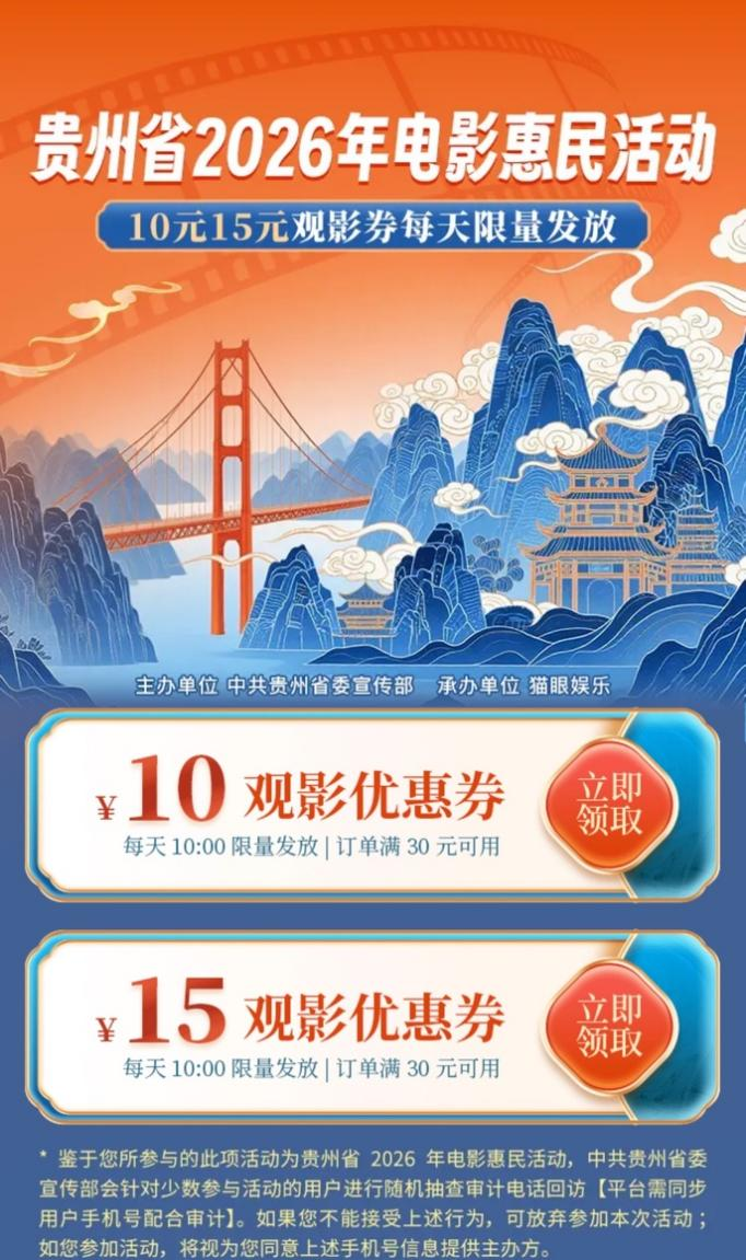 为吸引更多观众走进省内影院,促进贵州电影市场繁荣,贵州省委宣传部统筹投入500万元开展2026年电影惠民活动。活动从2025年12月19日开始至2026年3月9日,覆盖圣诞、元旦、春节等电影市场黄金档期,面向贵州省域内全部人员开展。
