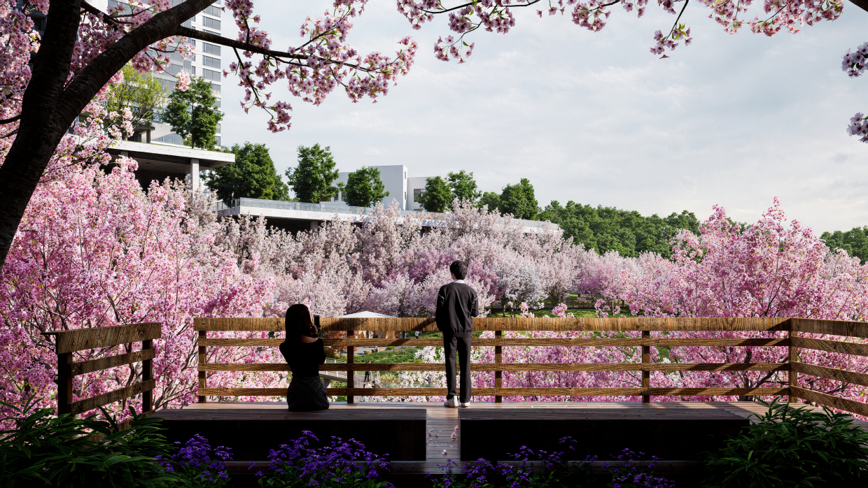 “项目以小湾河原生河湾盛景为基底,以一条连贯的生态脉络,串联观山湖公园与小湾河湿地公园两大城市级绿肺,在整体规划中,樱花、河湾、绿植与建筑空间形成有机联动,以原生地貌为脉络,以极简自然美学为主题,再造城市级风景。”项目相关负责人表示,通过开篇-沉浸-登高-休憩-收尾动线,将打造花见之门/樱之门/樱花漫步道/赏樱台/樱之亭/竹之亭/樱麓闲境等景观节点,以仪式感入口开启赏樱序列,借场地高差打造立体观花视角,俯瞰樱花谷全景,滨水休闲空间衔接小湾河绿道,实现樱花景观与水岸生态的自然收尾,层层递进,以樱花为情感载体,结合极简留白的营造手法,传递自然、诗意、静谧的东方生活美学。