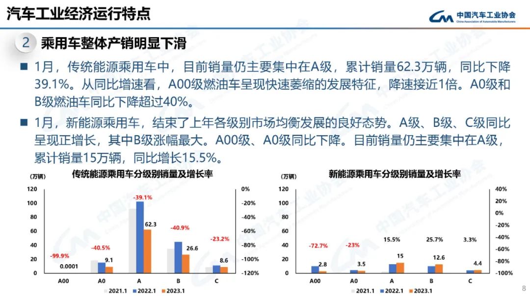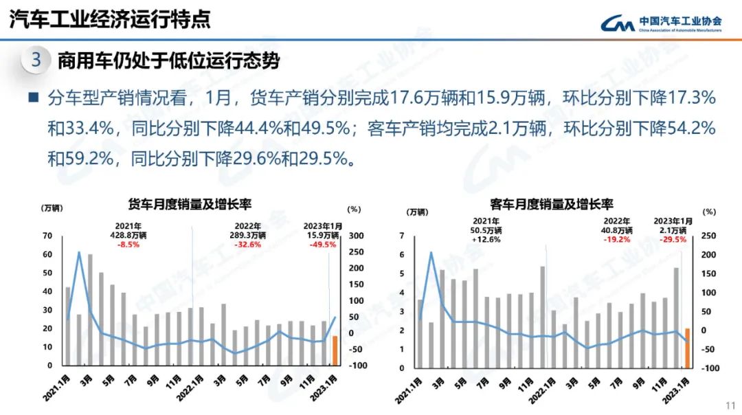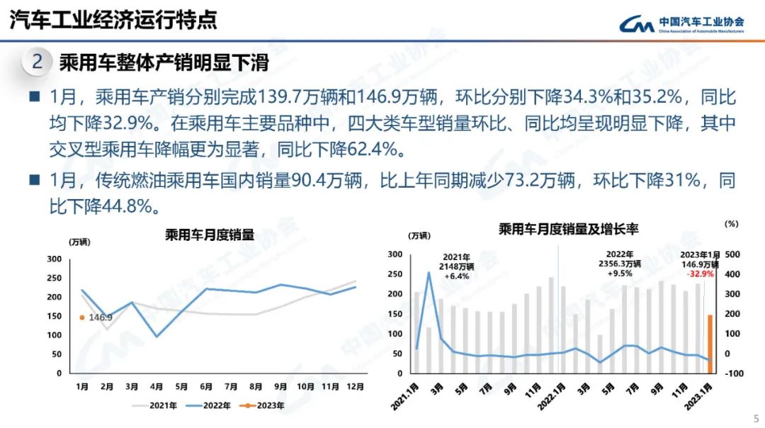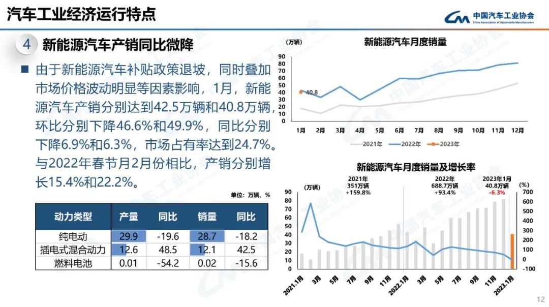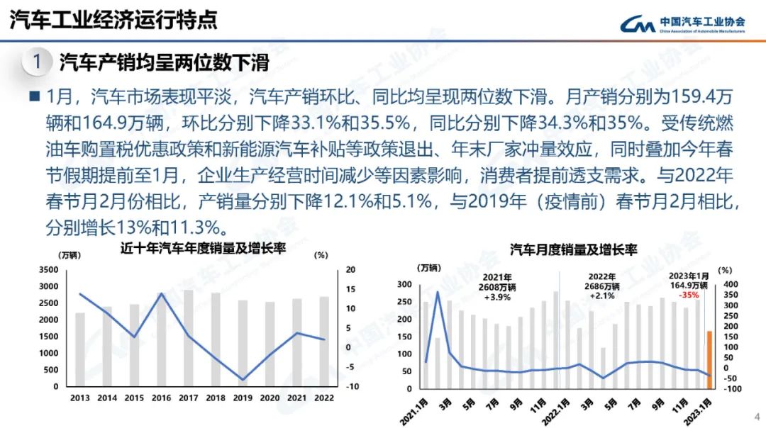 据中国汽车工业协会统计分析,2023年1月,受春节假期及部分消费需求提前透支影响,叠加传统燃油车购置税优惠和新能源汽车补贴政策退出,汽车市场表现平淡,产销环比、同比均呈现两位数下滑。