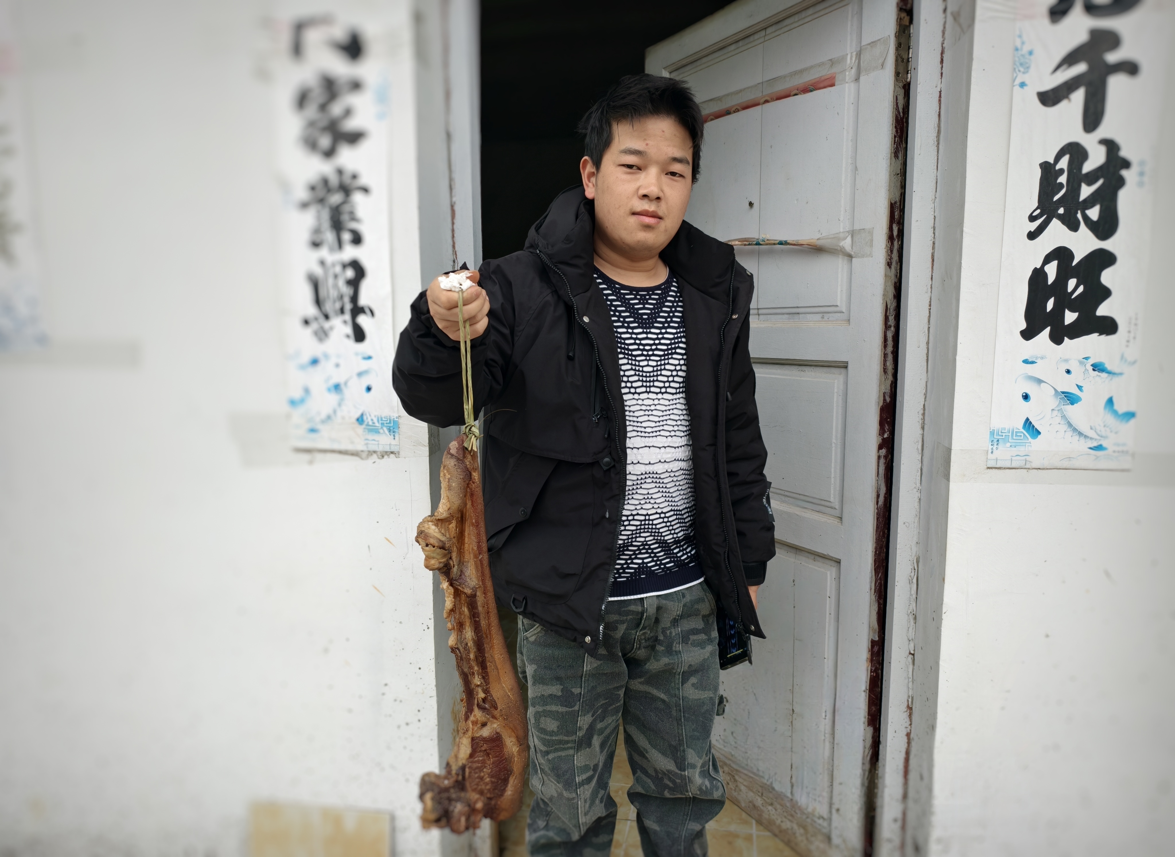 我听不见他说什么,但看懂了口型,他说的是:“柴火熏的腊肉,好吃。”