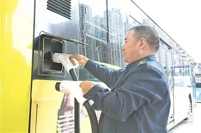 公交车师傅在给新能源公交车充电