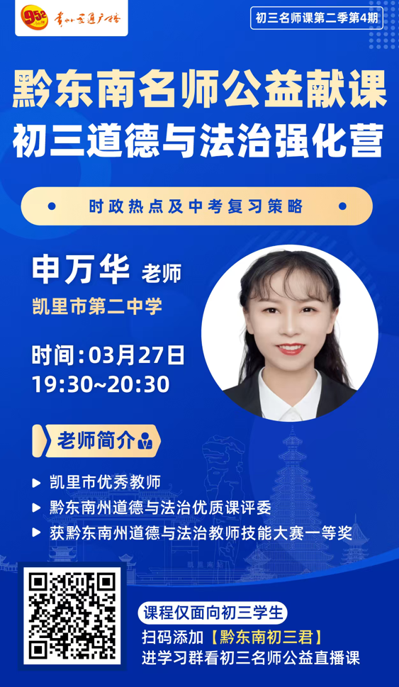 3月27日19:30-20:30,凯里市优秀教师、黔东南州道德与法治优质课评委申万华老师,将带来道德与法治专场授课,主题为“时政热点及中考复习策略”。申老师曾斩获黔东南州道德与法治教师技能大赛一等奖,深耕学科教学多年,深谙中考命题规律,本次课程将精准梳理时政热点考点,传授高效复习方法,助力学子攻克道法学科备考难点。