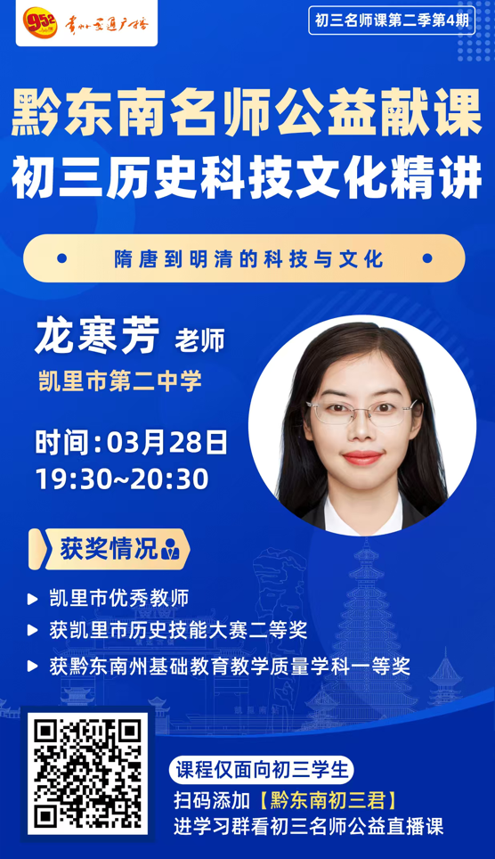 3月28日19:30-20:30,凯里市优秀教师龙寒芳老师将开启历史专题课堂,聚焦“隋唐到明清的科技与文化”展开深度讲解。龙老师曾获凯里市历史技能大赛二等奖、黔东南州基础教育教学质量学科一等奖,教学经验丰富,将带领学子梳理古代科技文化核心知识,拆解中考高频考点,夯实历史学科备考基础。