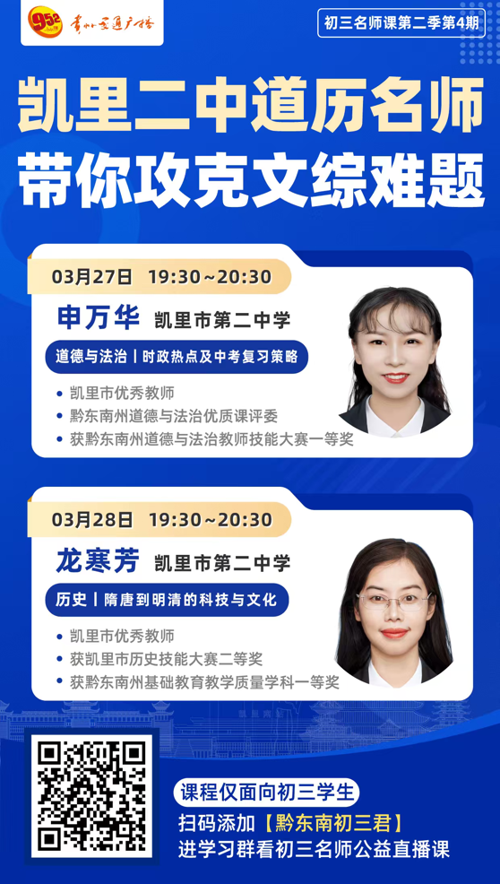 本季初三名师公益课始终秉持“遴选顶尖师资力量、精准聚焦核心考点”的核心原则,每一堂课程均经过精心打磨,在保证知识传授专业性、针对性的同时,充分适配线上教学的互动需求,全方位展现黔东南州教师队伍的卓越专业素养,为初三学子的中考备考之路保驾护航。本次凯里二中专场,学校两位资深道历名师强强联手,直击文综备考重点,拆解高频考点与解题技巧,为学子冲刺备考指点迷津。