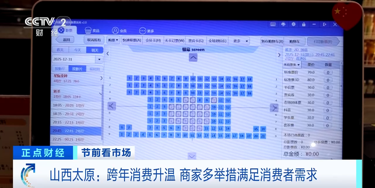 某电影院负责人 姜万泽:我们的预售情况现在还是比较火热,对部分场次我们也准备了花瓣雨,营造一个跨年的仪式感,让大家在氛围感中辞旧迎新。