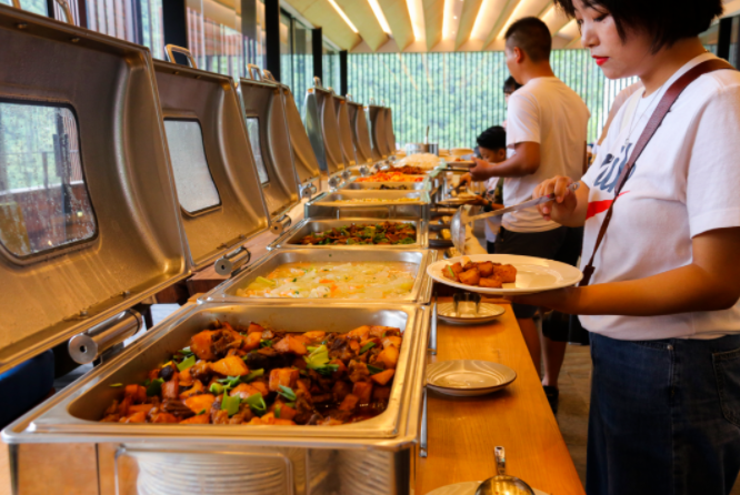 民宿的雨山前餐厅,宽敞明亮的布局,种类繁多的菜品,这里提供的是自助式用餐,主食、凉菜、炒菜、水果,应有尽有。