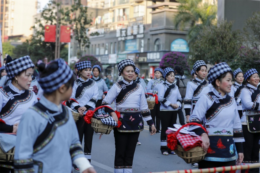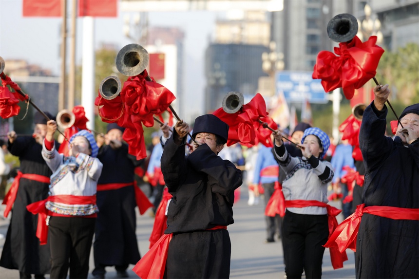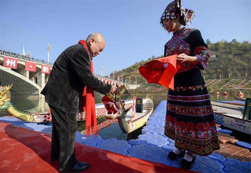 新年将至,贵州省黔南布依族苗族自治州罗甸县举行布依民俗踩街、舞狮、赛龙舟等活动,喜迎新年到来。( 图/文 史传鸿)