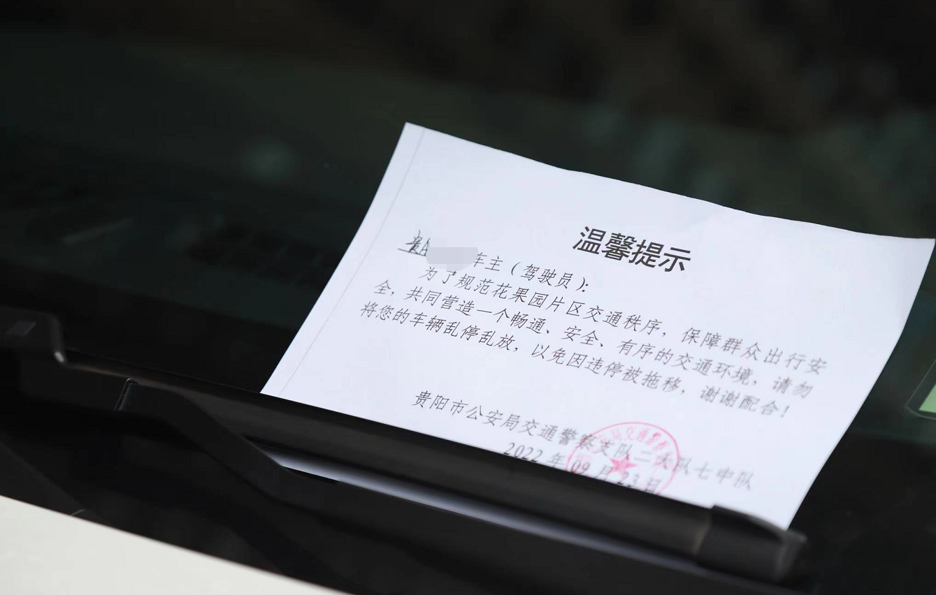 贵阳市公安交通管理局南明区分局七中队民警任海告诉记者,对于在花果园静默管理期间违停的车辆,交警通过在“违停”车辆上放置“温馨提示”的方式,提醒驾驶员安全有序停放车辆,如部分车辆驾驶人所在区域还未解封,则解封后尽快将车移至停车场,以免影响其他车辆通行。