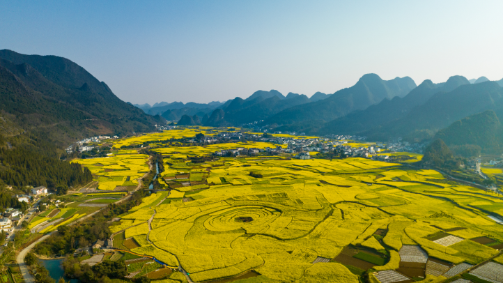 这里没有凛冽寒风,只有漫山遍野的金黄油菜花“抢跑”迎春。作为全国最早盛开的油菜花海,万峰林的田间从1月便开始酝酿春意,到春节恰是盛花期。一团团、一簇簇,汇集成一片金色的海洋。喀斯特地貌的锥状山峰,正像是一座座天然盆景,静静伫立在这片金黄色的绒毯之上。