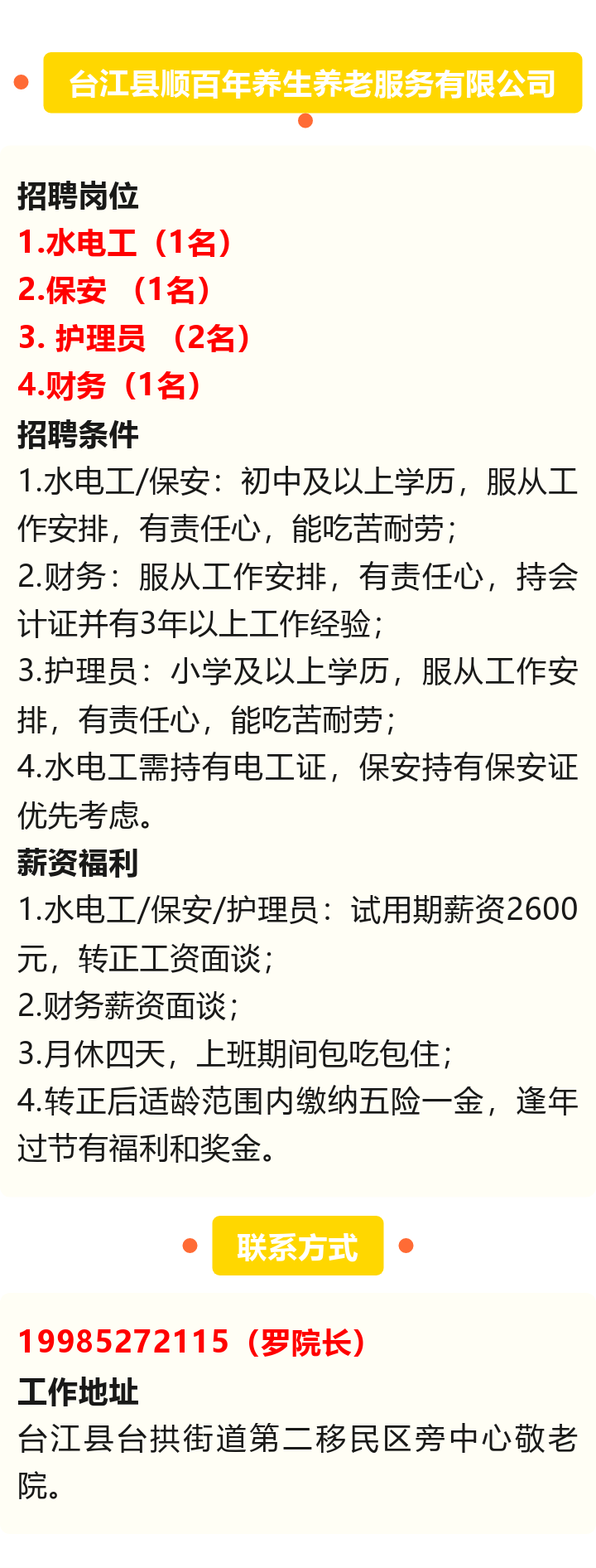 招聘水电工、保安、护理员、财务!包吃包住!五险一金!
