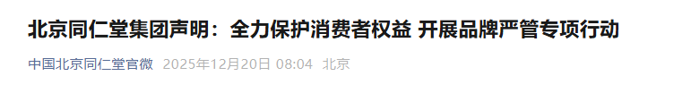 中国北京同仁堂(集团)有限责任公司12月20日发布声明: