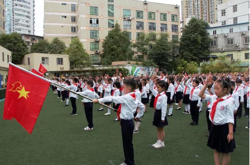在星星火炬的旗帜下,尚义路小学一年级的新队员们跟着大队长庄严而神圣地宣誓!