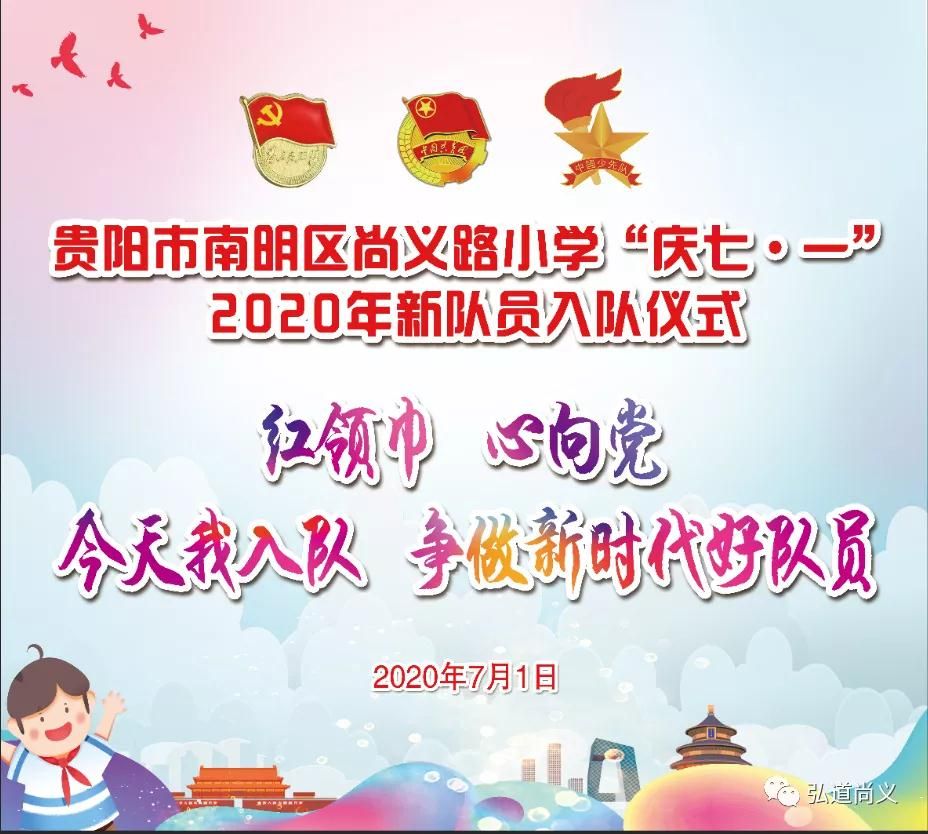 为深入学习贯彻习近平总书记致中国少年先锋队建队70周年贺信精神,迎接第八次全国少代会的召开,按照全国少工委要求,进一步坚定少先队员“听党话、跟党走”的信念,培养少先队员健康向上、积极进取的精神,全面促进少先队工作的蓬勃发展,在“七一”建党节这个特殊的日子里,中国少年先锋队贵阳市南明区尚义路小学大队委员会举行2020年庆七一“红领巾心向党 今天我入队 争做新时代好队员”入队仪式。