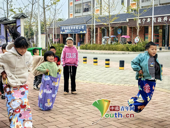 在志愿者刘思佳的带领下,孩子们换上新装,套上袋鼠袋,化身为一个个可爱的小雪人,在“一二三小雪人”的游戏中享受运动的快乐,感受冬日的暖意。(扬州大学第25届研究生支教团供稿)