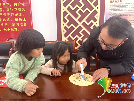 志愿者们帮助孩子们制作雪花贴画