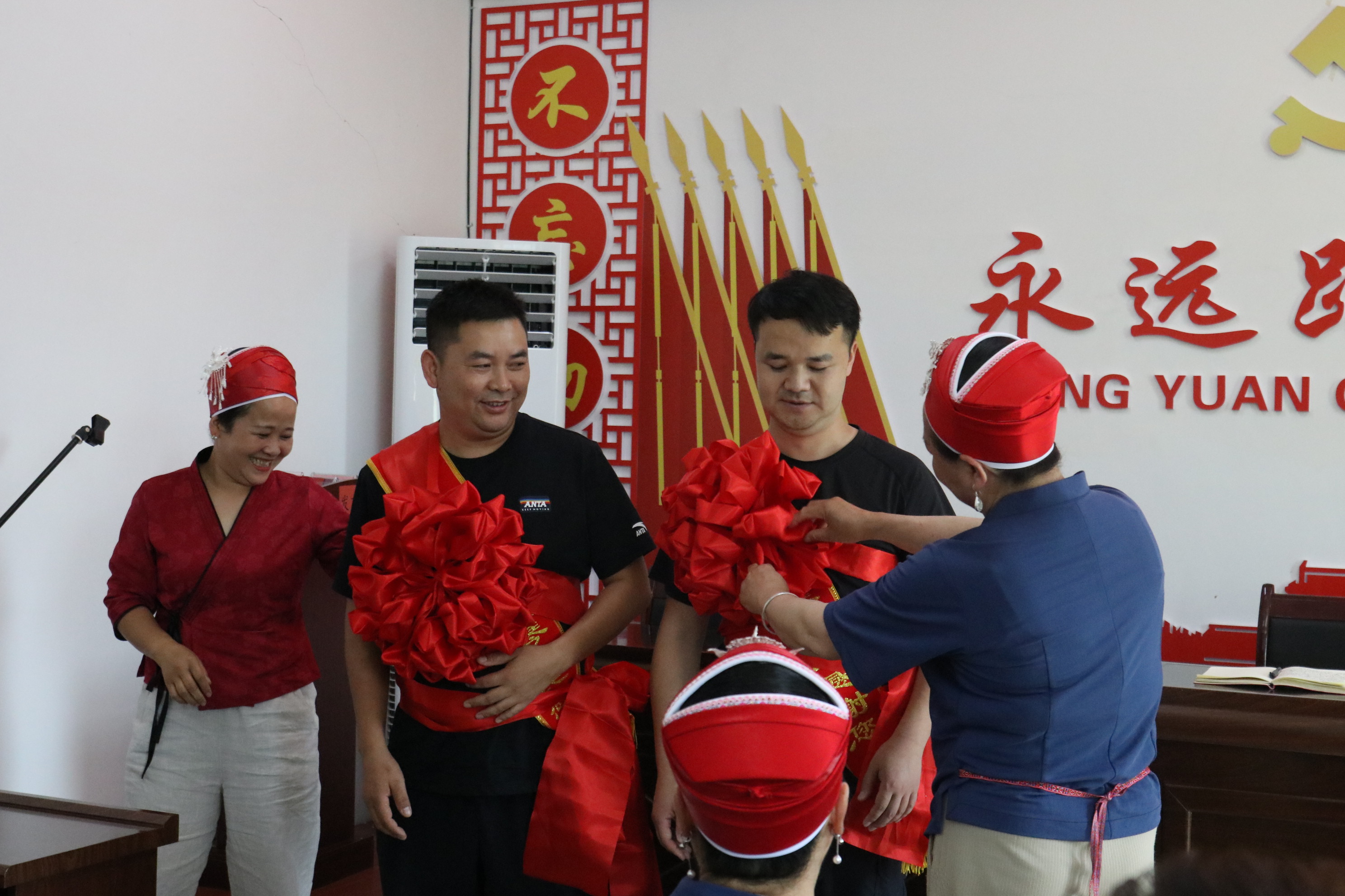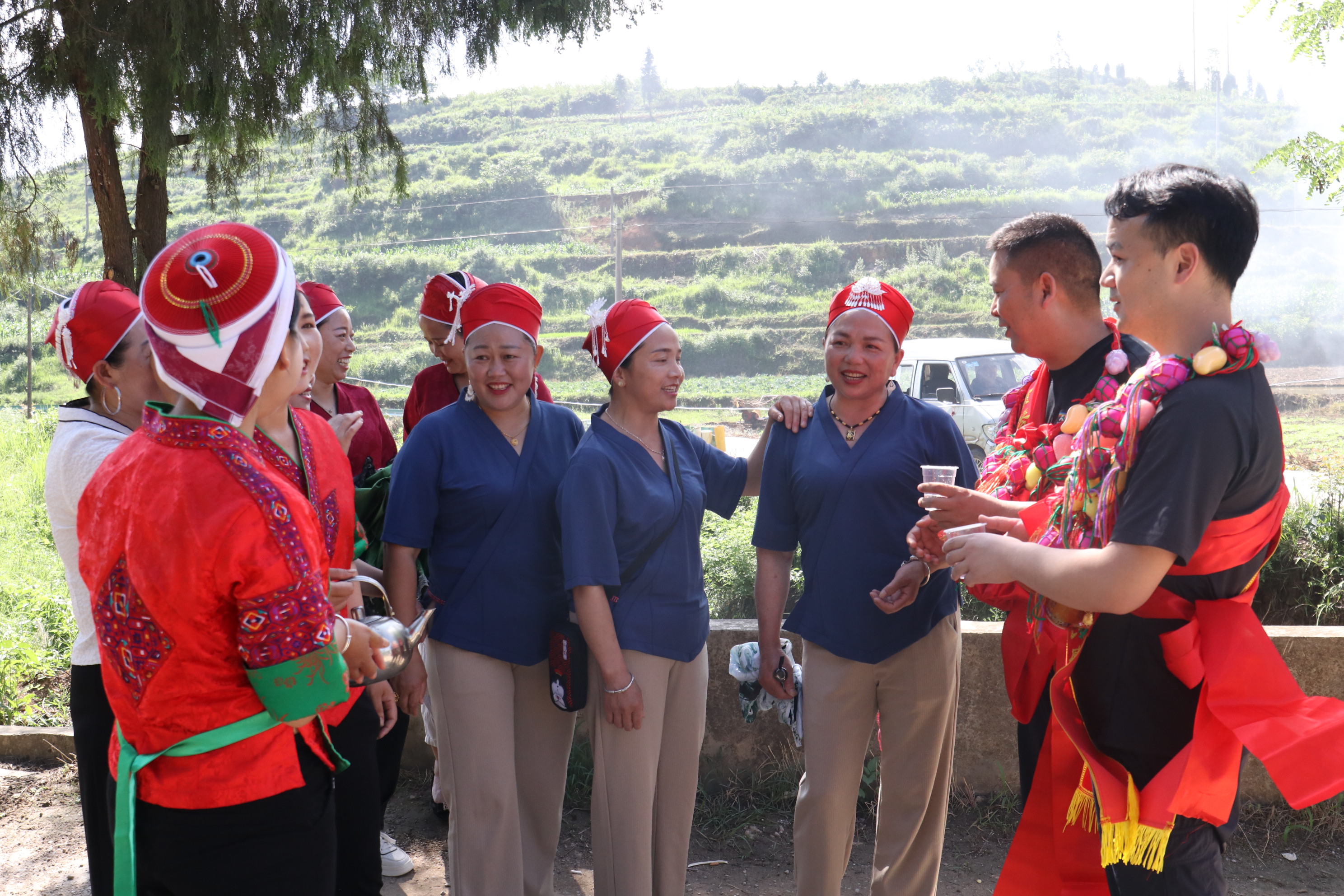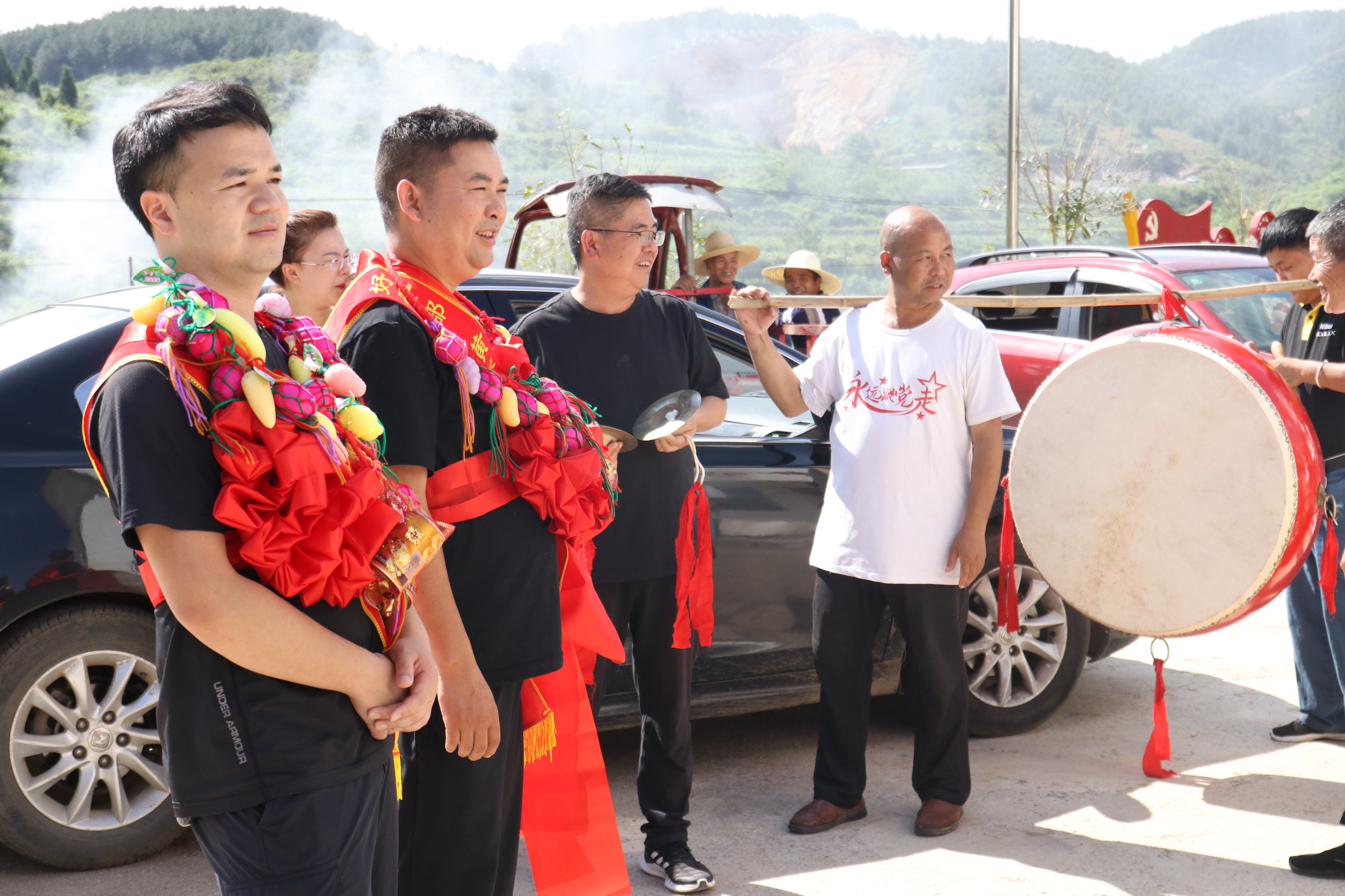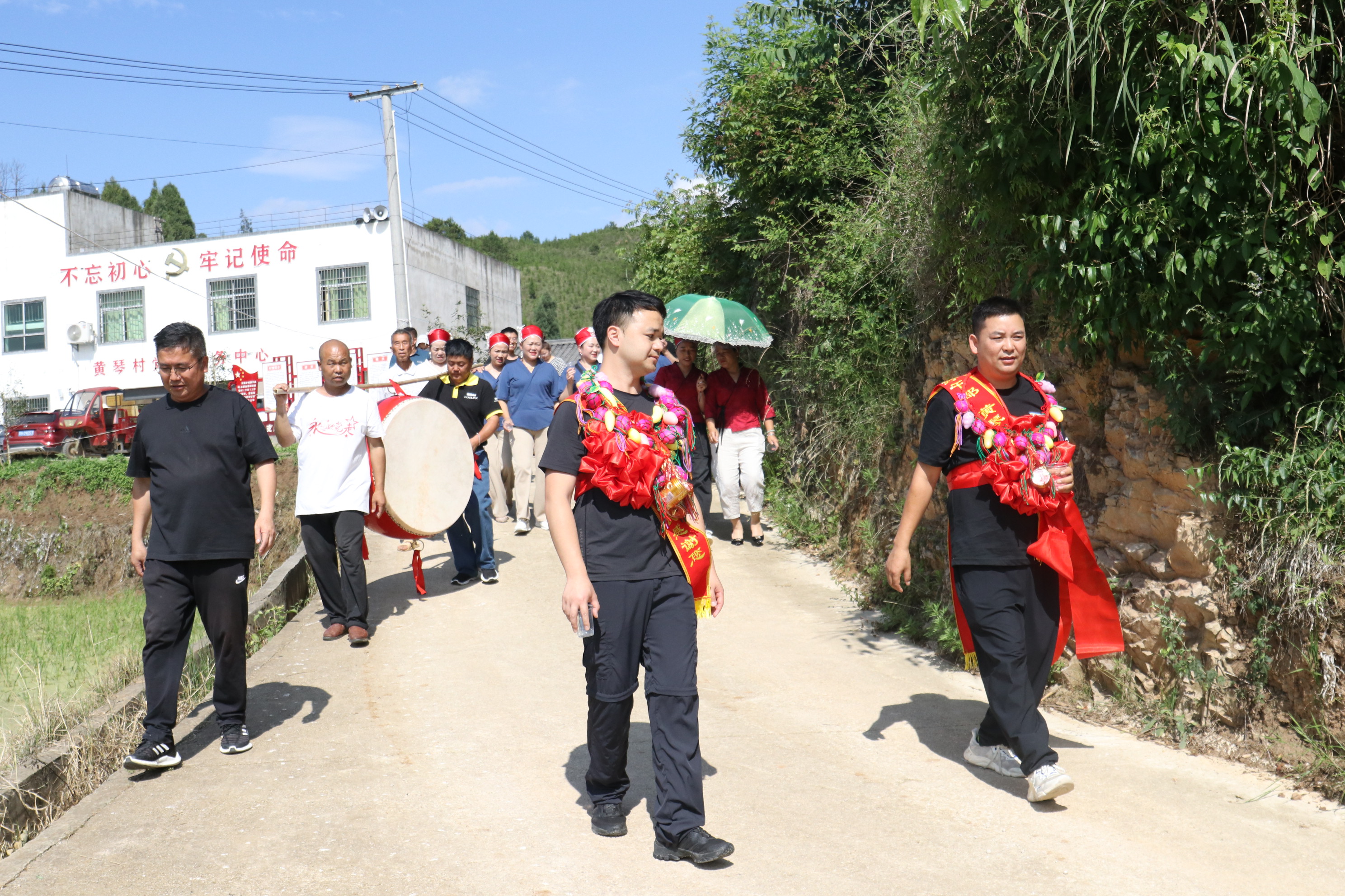 村民身穿苗族节日盛装,手捧自酿牛角米酒,敲锣打鼓,自发组成了30余人的代表队,以苗家人送别亲人的庄重仪式向驻村工作队等人表达感激和不舍之情。经过2年时间的驻村帮扶,驻村工作队们用实际行动拉进了与村民之间的距离,融入黄琴村,为群众排忧解难,带领当地村民发展产业、改善村容村貌等。为黄琴村巩固拓展脱贫攻坚成果同乡村振兴有效衔接工作做出了巨大贡献。离别之际,村民代表纷纷上前为他们佩戴绶带、红花,一路敲锣打鼓,叮嘱他们有空记得常回家看看,并用苗族歌声、美酒祝贺三位同志在新的工作岗位上工作顺利,节节高升。
