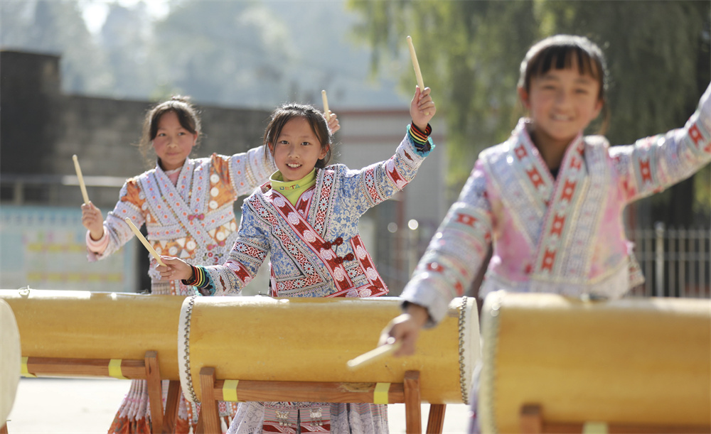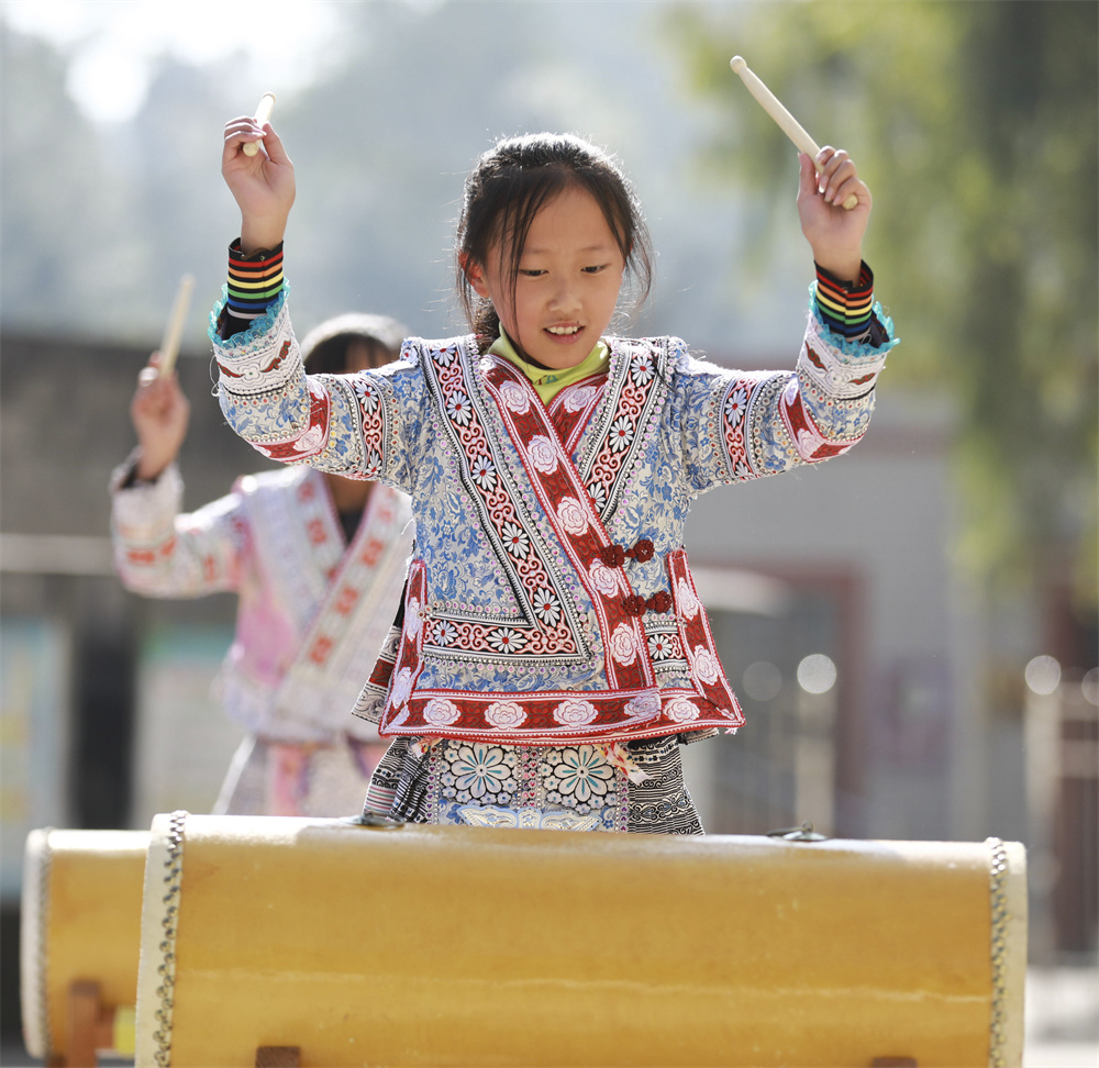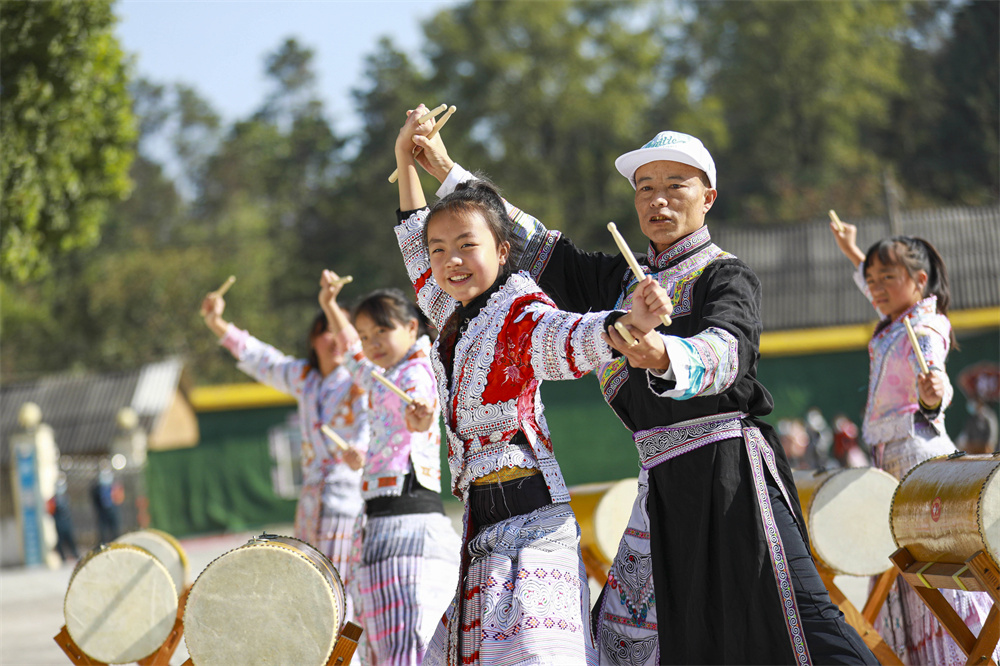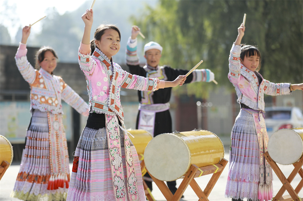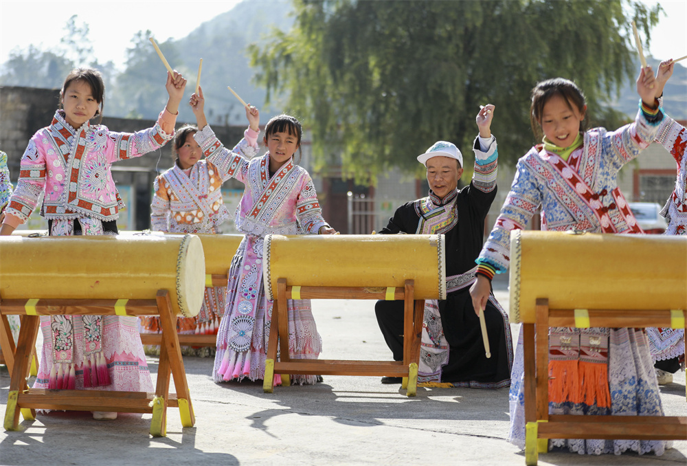 11月2日,贵州省黔西市新仁苗族乡新仁小学的老师在校园一角指导学生练习打鼓芦笙舞。