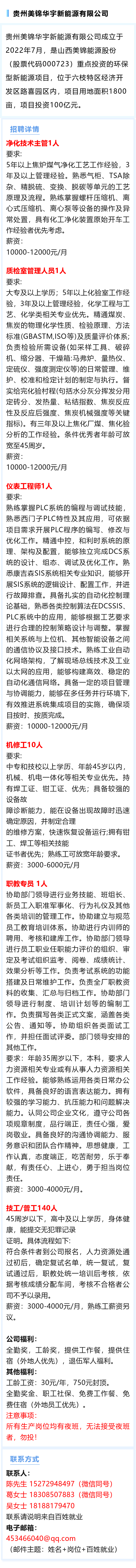 贵州美锦华宇新能源有限公司招聘技工/普工等岗位上百人!月薪可达12000元!提供工作餐,提供住宿(外地人优先)!