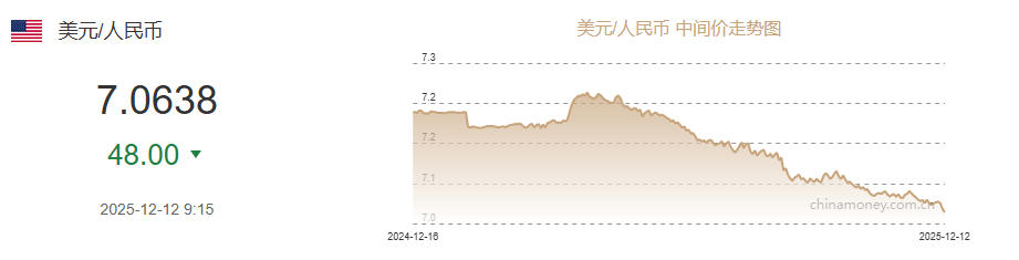 12月12日人民币对美元中间价报7.0638元 上调48个基点
