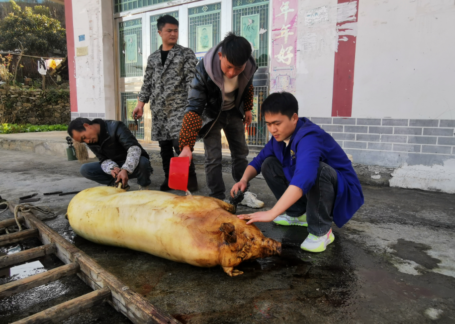 近日,官舟镇炉泉村何祖敏家炊烟袅袅。厨房里,乡亲们各自忙碌着,有的在烧火添柴,将水烧得咕噜咕噜翻滚;有的在择洗备菜,为即将到来的盛宴做准备。伴随着一声声响亮的吆喝,几位身强力壮的汉子齐心协力,把肥猪从猪圈里往外拉。众人分工明确,有的抓猪腿,有的揪耳朵,有的拽尾巴,费了一番力气,终于将大肥猪稳稳按在了杀猪架上 。