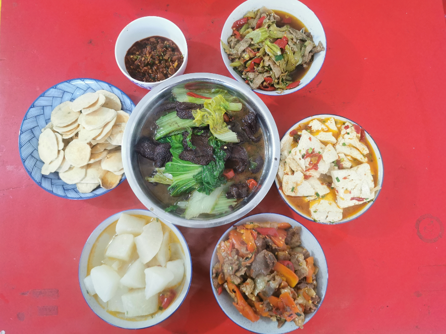 处理好的猪肉和内脏被及时送进厨房,妇女们大展身手,开始张罗这顿美味的“刨汤肉”。在她们的巧手下,不一会儿,丰盛的杀猪菜便摆满了桌面。热气腾腾的猪肉片、色泽诱人的猪血、鲜嫩多汁的猪肝……每一道菜都让人垂涎欲滴。