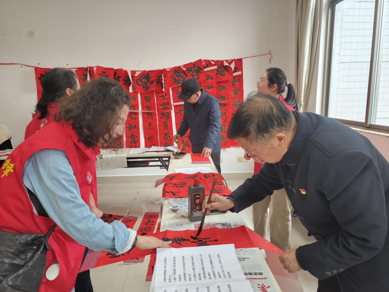活动现场,书法爱好者和党员志愿者们齐聚一堂,挥毫泼墨,饱蘸浓墨的毛笔在红纸上起落流转,“龙腾虎跃人间景,马到成功天下春”“岁岁平安福寿多,年年顺景财源广”,喜庆的词句搭配灵动的笔墨,承载着大家对新年的美好期盼。居民们围在桌前,有的认真挑选心仪的春联,有的兴致勃勃地请老师定制专属祝福,还有不少书法爱好者主动参与,现场书写赠送给邻里,欢声笑语回荡在活动现场。一幅幅红彤彤的春联、一张张金灿灿的“福”字,不仅为即将到来的春节增添了喜庆色彩,更拉近了邻里之间的距离。居民们手捧满载祝福的春联,脸上洋溢着幸福的笑容。