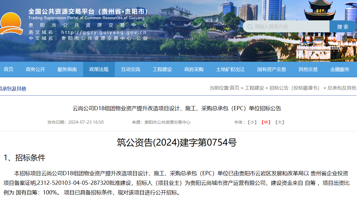 7月23日,贵阳市公共资源交易中心发布关于云尚公司D18组团物业资产提升改造项目设计、施工、采购总承包(EPC)单位招标公告。该项目已由贵阳市云岩区发展和改革局以贵州省企业投资项目备案证明,2312-520103-04-05-287320批准建设,招标人(项目业主)为贵阳云尚城市资产运营有限公司,建设资金来自自筹,项目出资比例为国有自筹:100%。 项目已具备招标条件,现对该项目进行公开招标。
