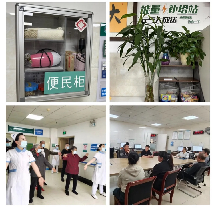 团队从患者实际需求出发,在病区精心设置了“能量补充站”,为治疗期间体力不足的患者准备了低糖坚果、粗粮饼干等健康零食;创新推出“健康知识云分享”平台,患者扫码即可获取专业的疾病管理和康复指导;贴心的“便民柜”里整齐摆放着毛巾、雨伞、电吹风等日常用品,随时解决患者的生活不便;定期组织的康复操活动不仅帮助患者恢复身体机能,更搭建起医患互动、病友互助的温馨平台;每月举行的公休座谈会则进一步拉近了医患距离,通过面对面的真诚交流增进理解与信任。