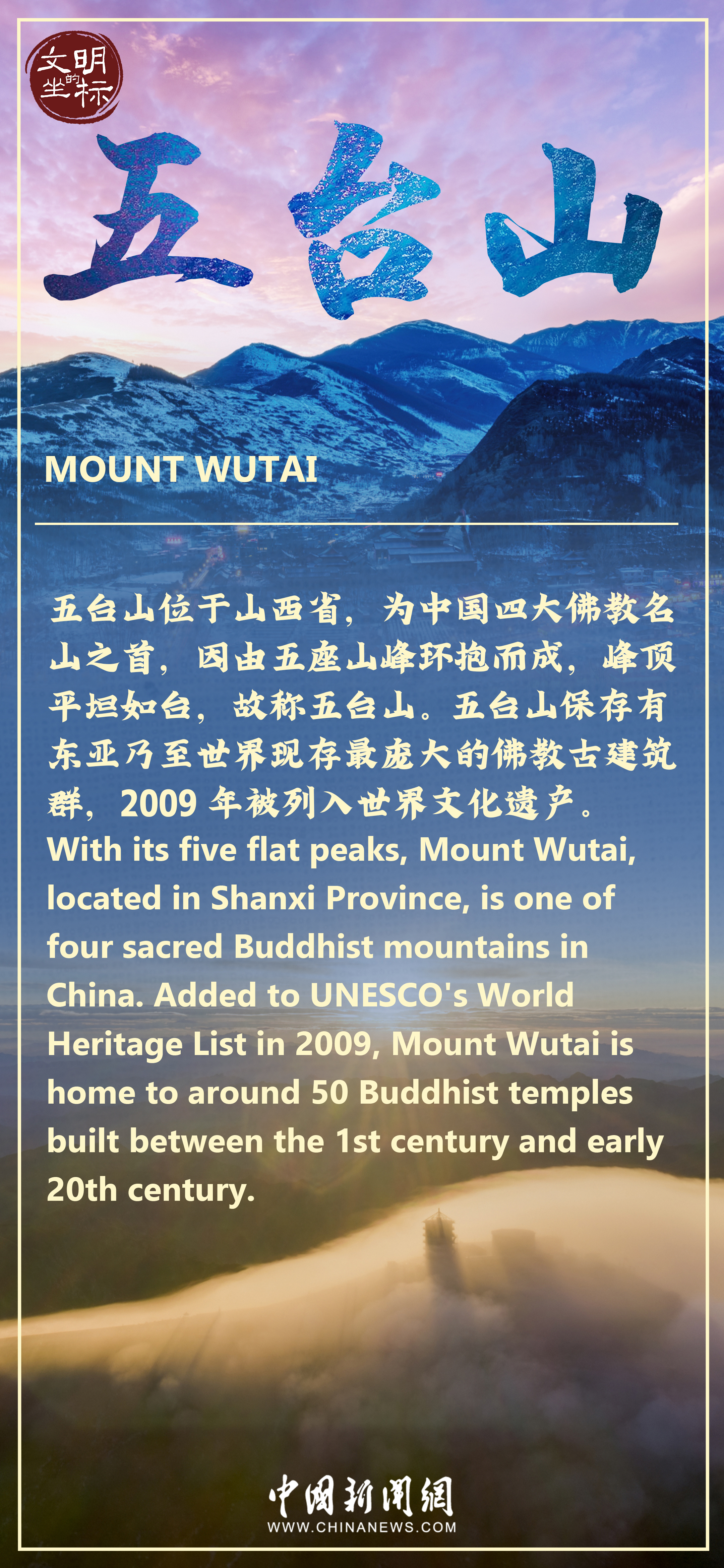 五台山位于山西省,为中国四大佛教名山之首,因由五座山峰环抱而成,峰顶平坦如台,故称五台山。五台山保存有东亚乃至世界现存最庞大的佛教古建筑群,2009年被列入世界文化遗产。来五台山,纵览明山秀水,领略自然雄奇,感悟中华文化的博大精深。