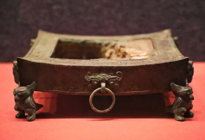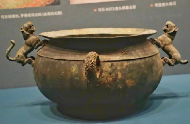 上图中的文物,是目前国内仅见于可乐土著墓的“套头葬”。2000年,考古人员挖掘开贵州省赫章县可乐乡274号墓,一铜器侧立套于逝者头部,保护着主人,这就是西汉早期的“立虎辫索纹耳铜釜”,该器形体硕大,肩腹部对称饰一对圆雕立虎,造型极为罕见,是国内目前为止出土的唯一一件有立虎造型的铜釜。
