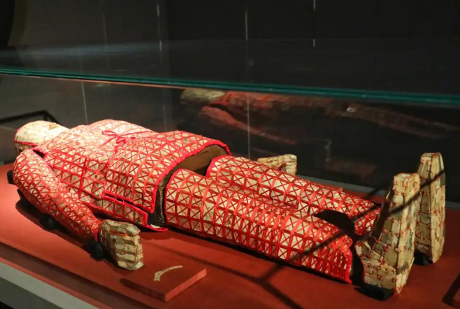 “丝缕玉衣”,南越王的敛(殓)装。其长1.73米,共用了2291片玉,玉衣上下铺垫了29块玉璧。因为年代久远,出土时丝织物已基本腐朽,玉片散落一地。后使用石膏将玉衣“整体打包”运送至北京社科院,共花费3年时间才修复完毕。