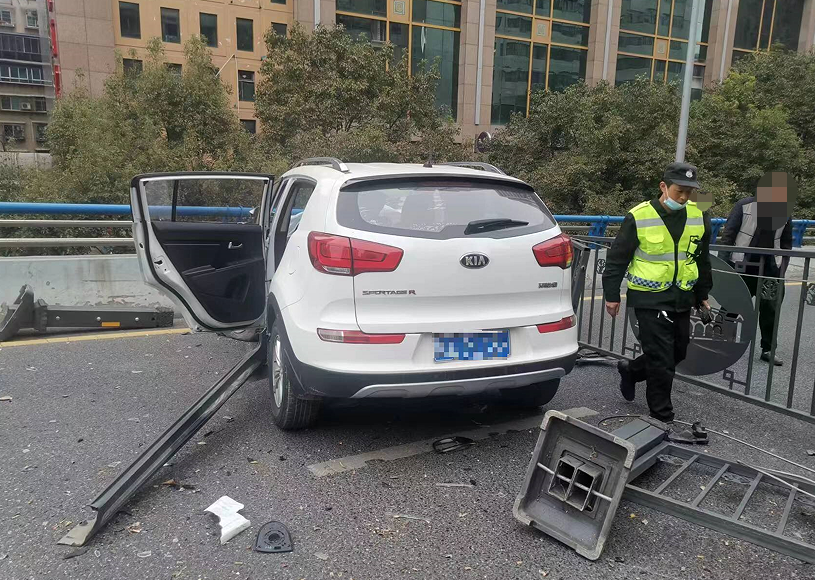 指挥中心立即将警情转至辖区内的六中队,民警以最快速度赶往事故现场后发现,北京西路出城向的高架桥面交通处于中断状态,一辆白色小轿车横向停在道路上,事故现场散落着车辆和隔离护栏的碎片,事故现场一片狼藉。