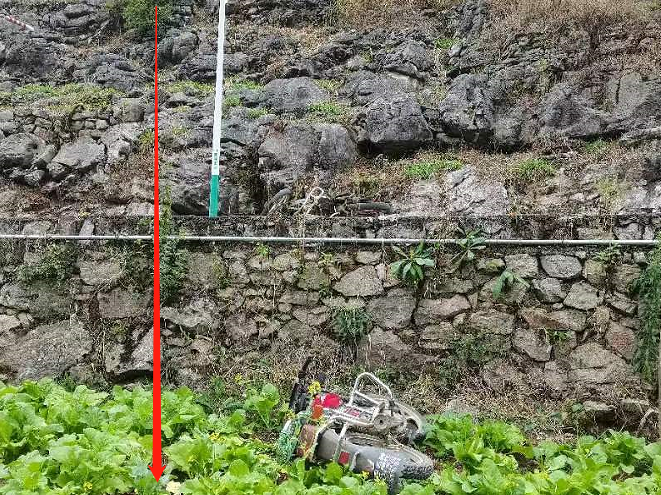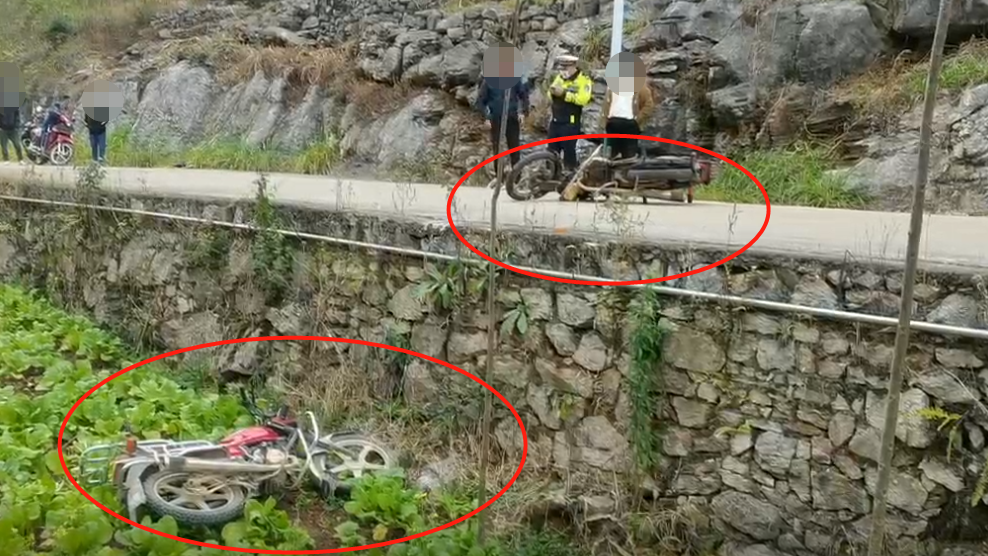 民警抵达事故现场看见,一辆黑色摩托车侧翻在道路中间,而在路旁的田地里还有一辆红色摩托车,地里有红色摩托车的后视镜,路上掉落了一个车灯灯壳。