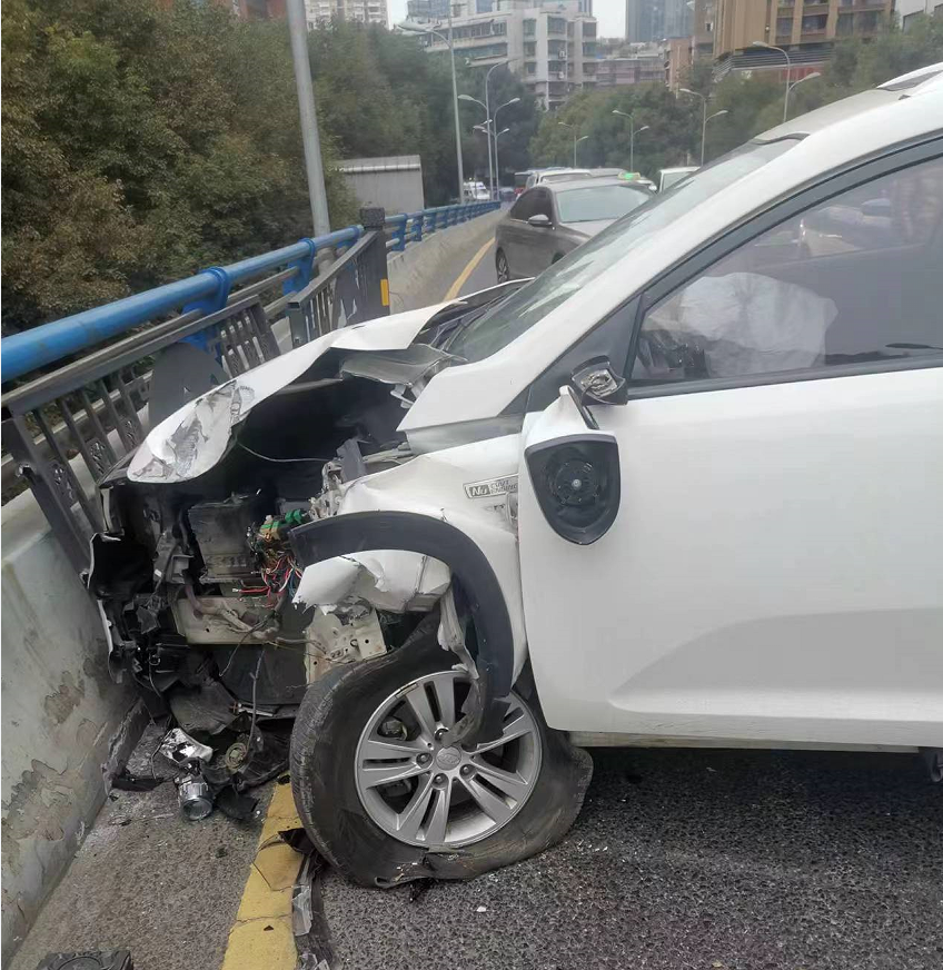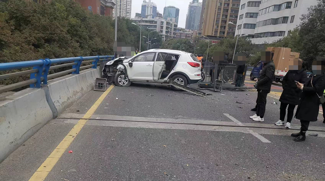 白色小轿车在撞坏道路隔离护栏后,冲到对向横停在道路中央,车前引擎盖撞上桥墩,车辆左前方引擎盖受损严重,驾驶位安全气囊弹出。