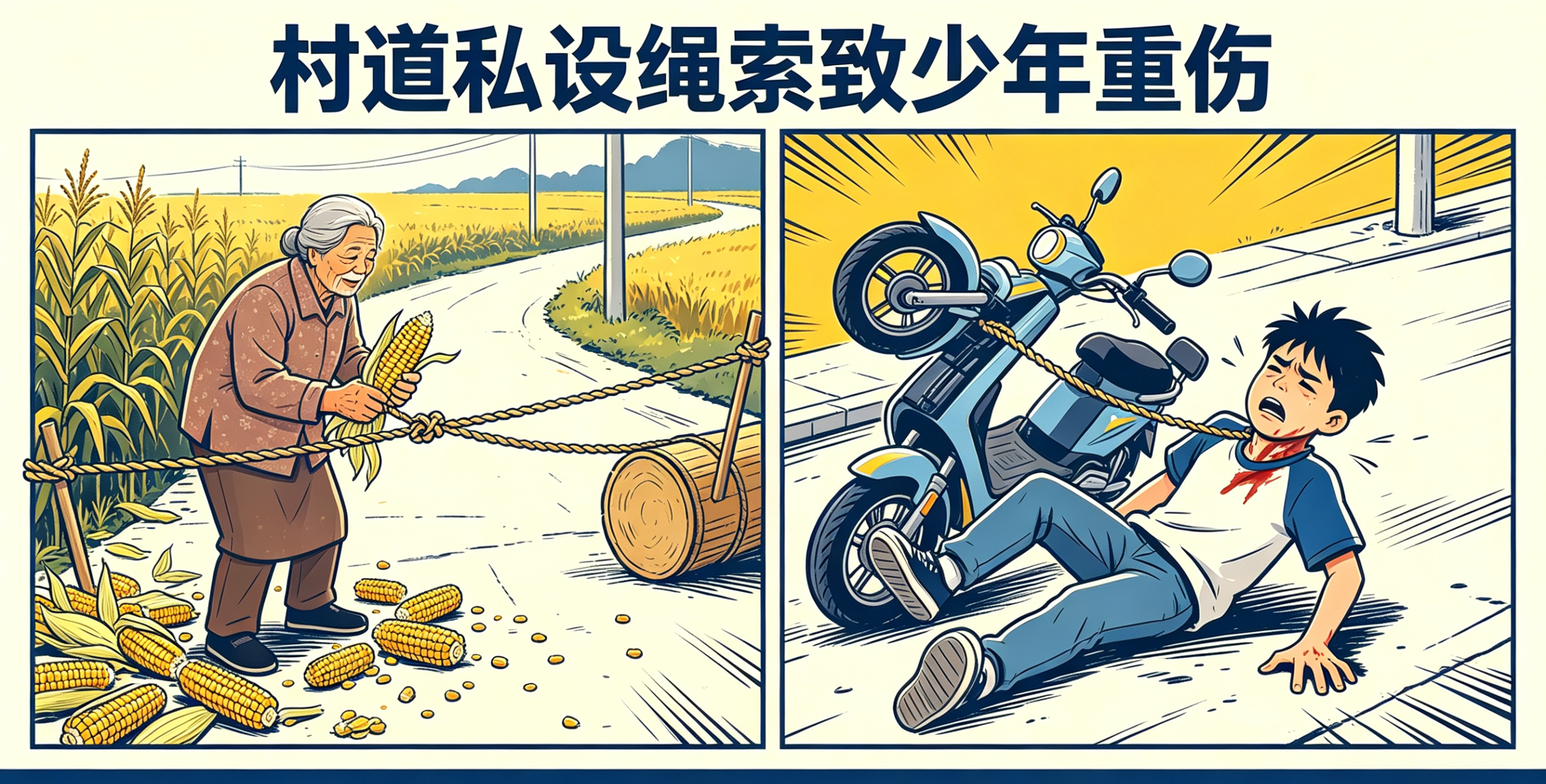 近日,河南焦作沁阳市某村发生一起令人痛心的事故。一名老人为给玉米脱粒,在村道上私自拴绳拦路。一名13岁男孩骑电动自行车上学路过此地,被绳索割喉摔倒,受伤严重。男孩忍痛托着头部跑回家中求救。