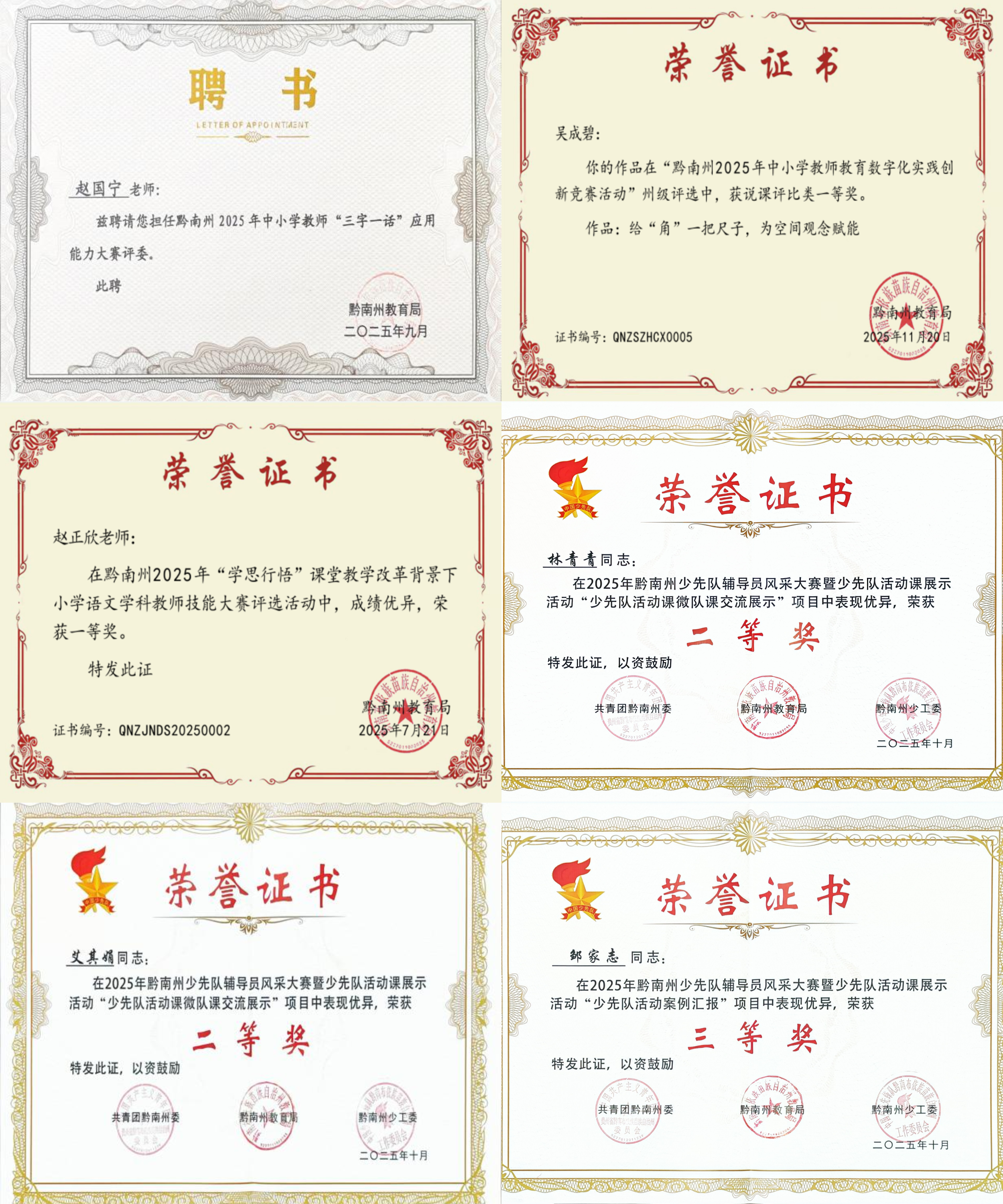 以赛促优结硕果。鼓励师生积极参与各级各类竞赛活动,以赛促学、以赛促练、以赛促优。学生在学科竞赛、艺术展演、体育竞技、科技创新等领域捷报频传。累计斩获省级一等奖2项、省级二等奖3项、省级三等奖2项、省级优秀奖1项;州级一等奖15项、州级二等奖14项、州级三等奖8项、州级优秀奖2项;市级一等奖6项、市级二等奖8项、市级三等奖1项、市级优秀奖3项。教师团队秉持“以研促教、深耕课堂”理念,积极投身省、州、市级课题研究、教学竞赛、师德评选等活动,专业能力与育人水平持续提升。累计荣获省级一等奖5项、省级二等奖3项;州级一等奖4项、州级二等奖3项、州级三等奖6项、州级优秀奖6项;市级一等奖3项、市级二等奖2项、市级三等奖4项、市级优秀奖3项。