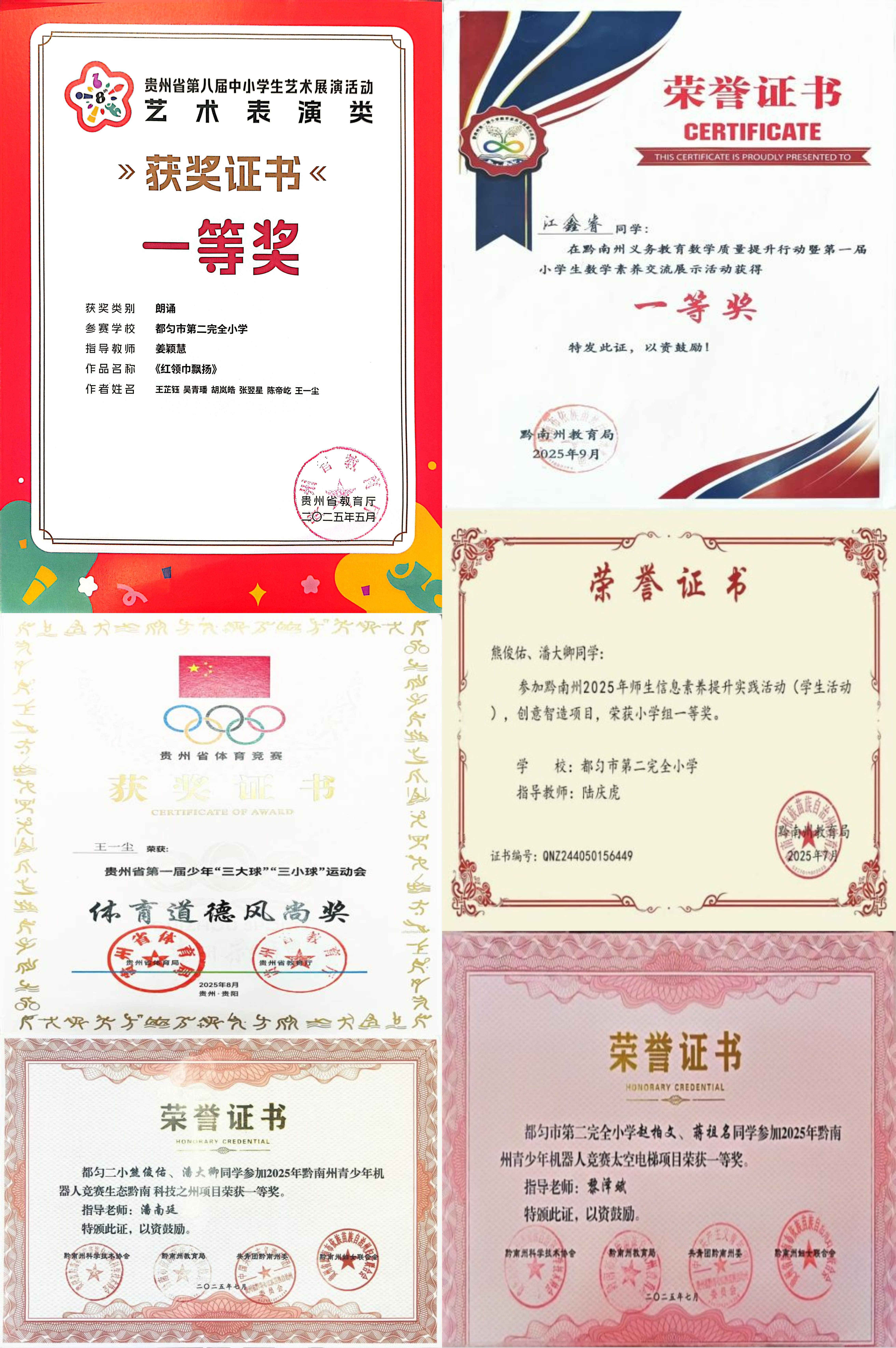 “双减”提质优课堂。以“双减”政策落地见效为抓手,聚焦课堂教学效率提升,构建“基础+特色+拓展”三级课程体系,实现基础知识巩固与综合能力培养双提升。在语、数、英等核心学科教学中,推行“精讲多练、因材施教”的教学模式,通过集体备课、公开课研讨、教学反思复盘等教研活动,持续优化教学流程,夯实课堂教学质量。语文、数学、艺术等教研组深耕教学科研,在教材解读、教学设计、课题研究等方面成果丰硕,获都匀市教育局表彰。学校承办贵州省省级小学数学教研活动、黔南州少先队辅导员专业技能大赛、黔南州师生素养提升实践活动“创意智造”项目竞赛等活动。教学质量持续领跑,斩获都匀市小学阶段“教学质量特殊贡献奖”。此外,学校已连续4年蝉联都匀市小学教学质量监测一等奖,彰显强劲教学实力。