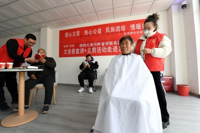 近日,在河北省文安县友谊路社区党群服务中心,一场主题为“‘双争’有我 理响大清河畔 宣讲服务基层”的爱心义剪活动受到社区居民的肯定和欢迎。活动现场,理发师志愿者为辖区内的老年朋友提供免费义剪服务,宣讲志愿者向等待义剪的群众进行宣讲。