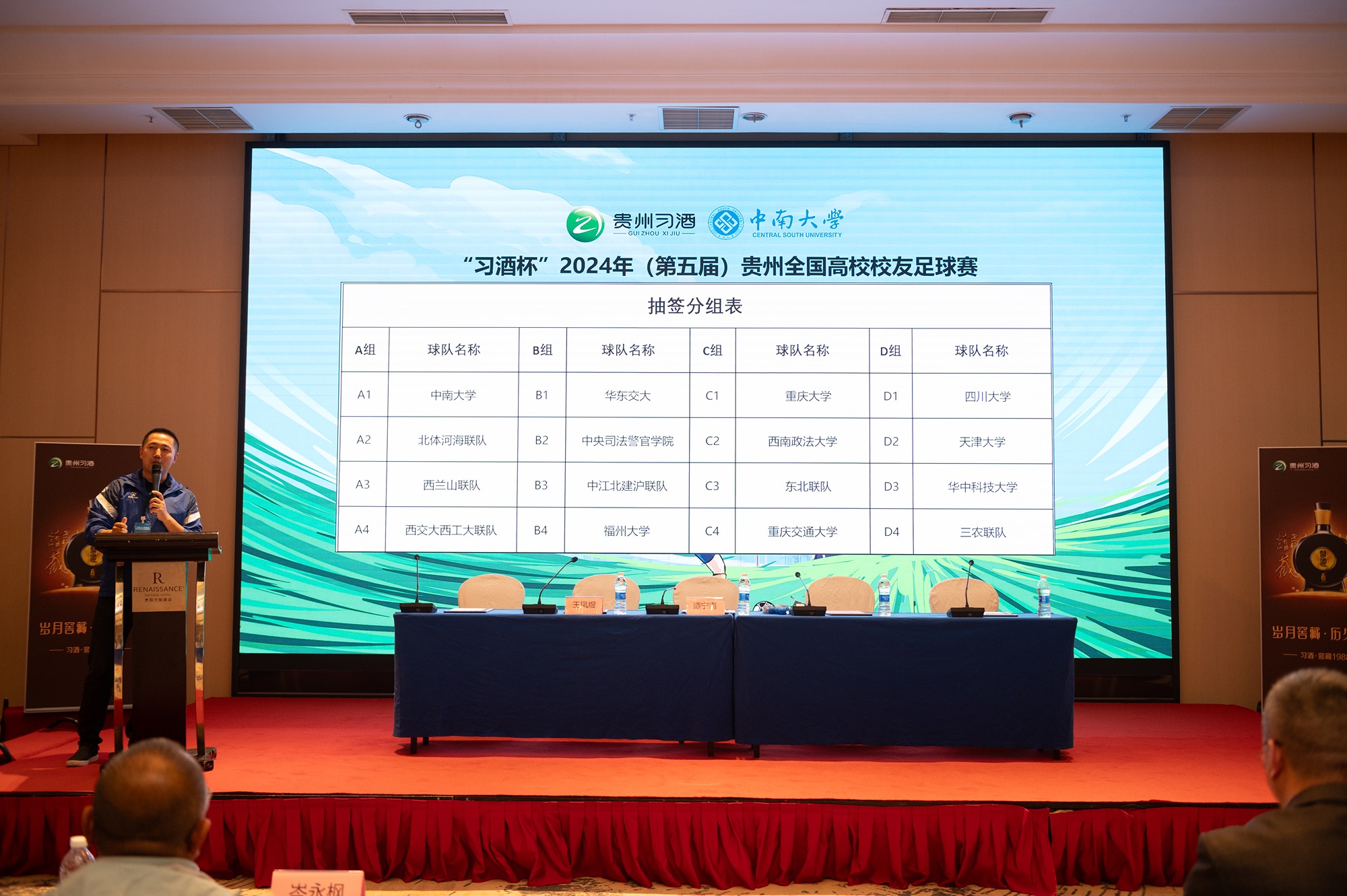 贵阳市足球协会主席岑永枫、贵州习酒销售有限责任公司黔中区总经理赵凡及副总经理张元杰、贵州泰鼎和盛贸易有限公司总经理王凤煜等嘉宾、清华大学、浙江大学、重庆大学、天津大学、武汉大学等贵州校友会代表、各参赛队伍代表及赛事主办方中南大学校友企业家联谊会谭宁南理事出席发布会。