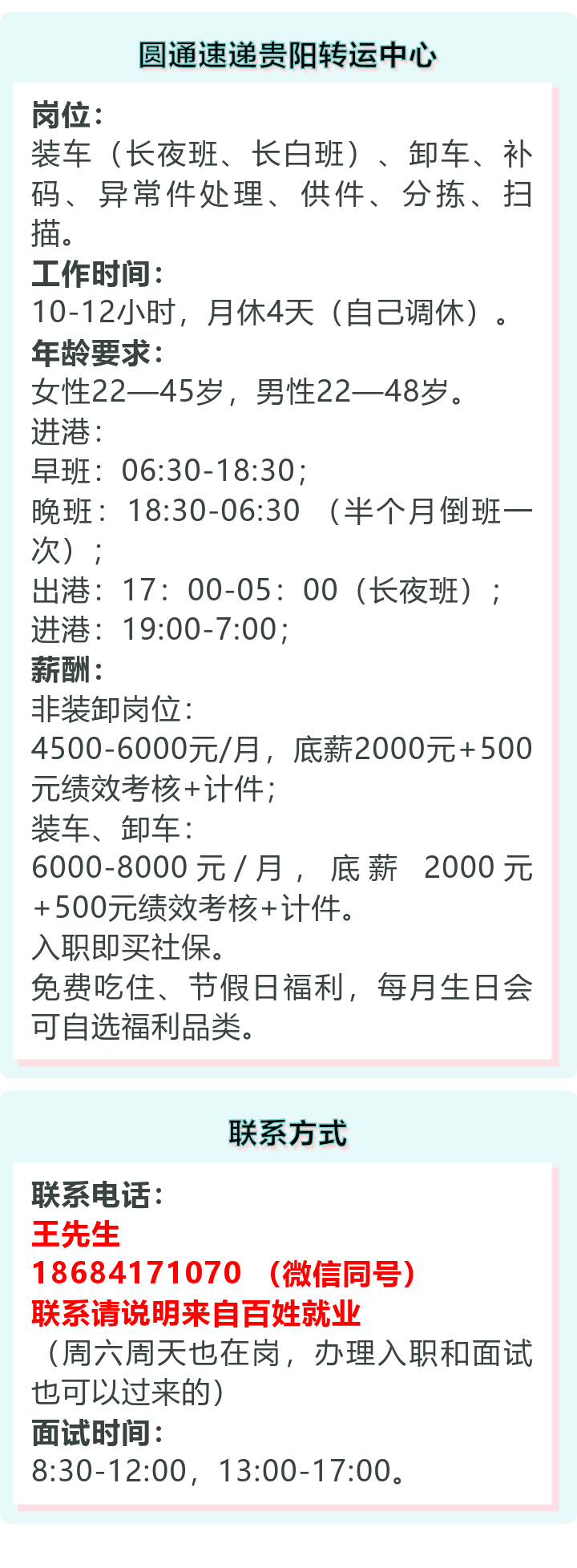 圆通速递贵阳转运中心招聘!月薪4500~8000元!免费吃住!
