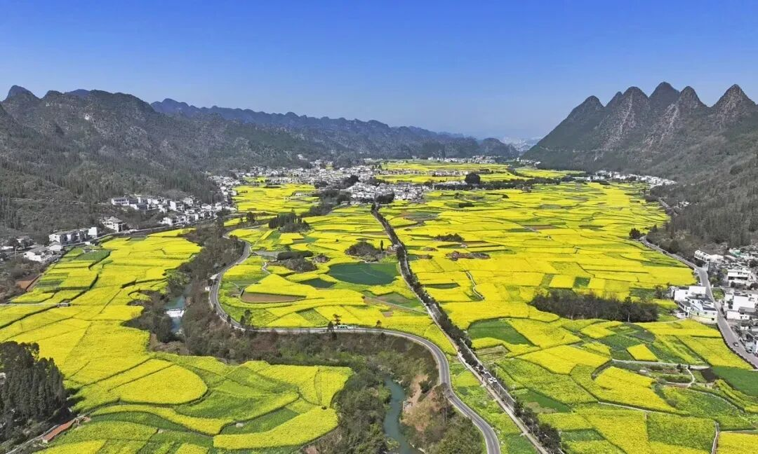 春季的万峰林油菜花盛开,金黄的田野与奇特的峰林相映成趣,构成绝美的田园画卷。金黄的花海与青黛的峰丛、蜿蜒的纳灰河、错落的布依村寨构成一幅立体的田园画卷。