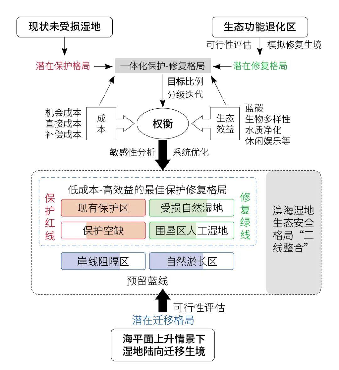 模拟评估保护修复目标、社会经济成本和修复后生态效益之间的权衡关系,确定“目标-成本-效益”协同优化的一体化湿地保护修复格局;