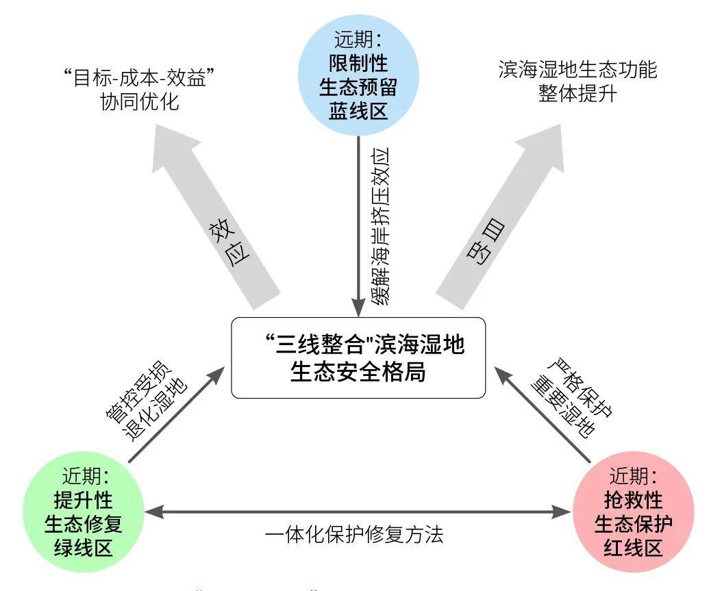 据此,文章提出了应对围垦开发和适应海平面上升情形下“三线整合”中国滨海湿地生态安全格局相关概念,包括:抢救性保护生态红线区,优先开展湿地修复的生态修复绿线区,以及适应气候变化影响下海平面上升的生态预留蓝线区。文章在剖析相关概念的基础上,聚焦我国大江大河三角洲,针对滨海湿地保护修复、海岸带管理和国土空间开发提出了相关措施和建议。
