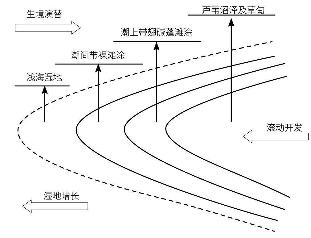 识别海平面上升和滨海湿地围垦影响下,滨海湿地生态系统潜在陆向迁移通道及其迁移格局,划定适应海平面上升的预留蓝线。
