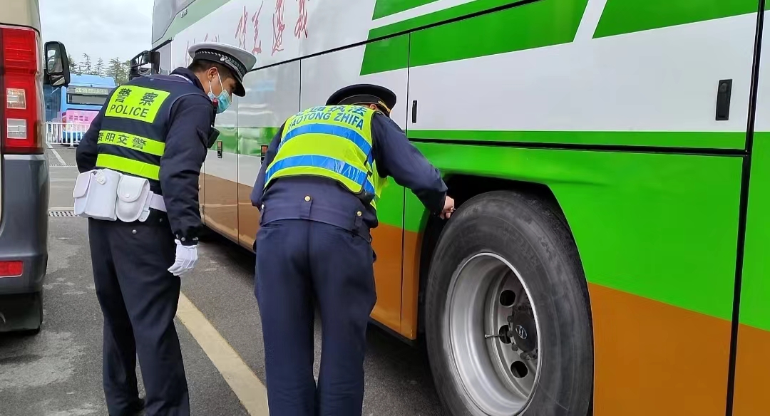 “乘客您好,我是贵阳市交通执法支队的,欢迎大家来到贵州旅游。今天我们查到这辆车的轮胎存在安全隐患,我们已经及时调派了其它车辆来保证大家的安全……”