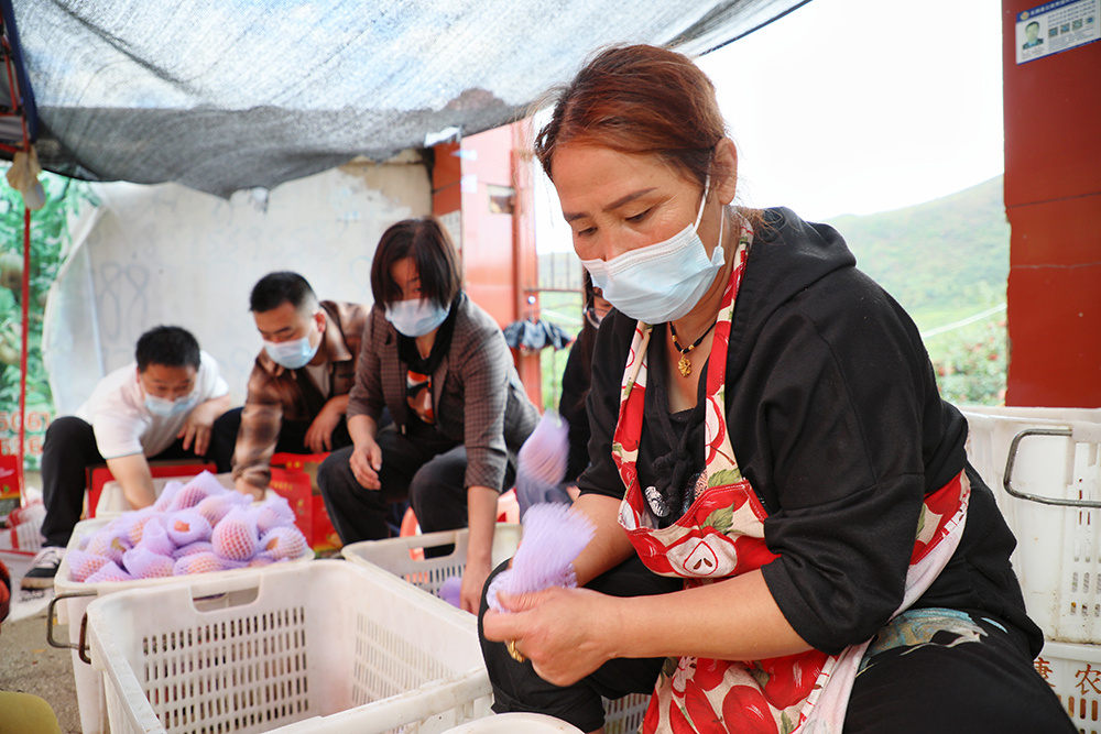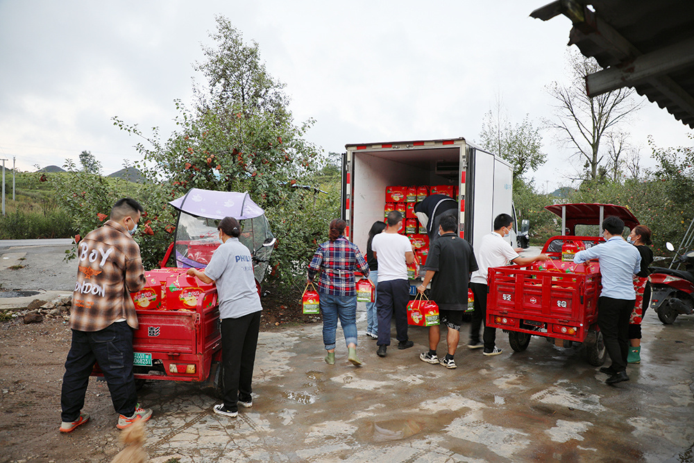 走进长顺县广顺镇广农社区葫芦坡苹果园,果农纪同贵、沈碧芳等人正手脚麻利地摘下覆满水珠的苹果,另一边的志愿者正在套袋、打包、装车……一派繁忙景象。
