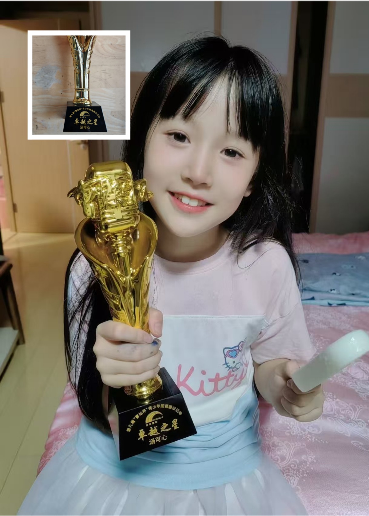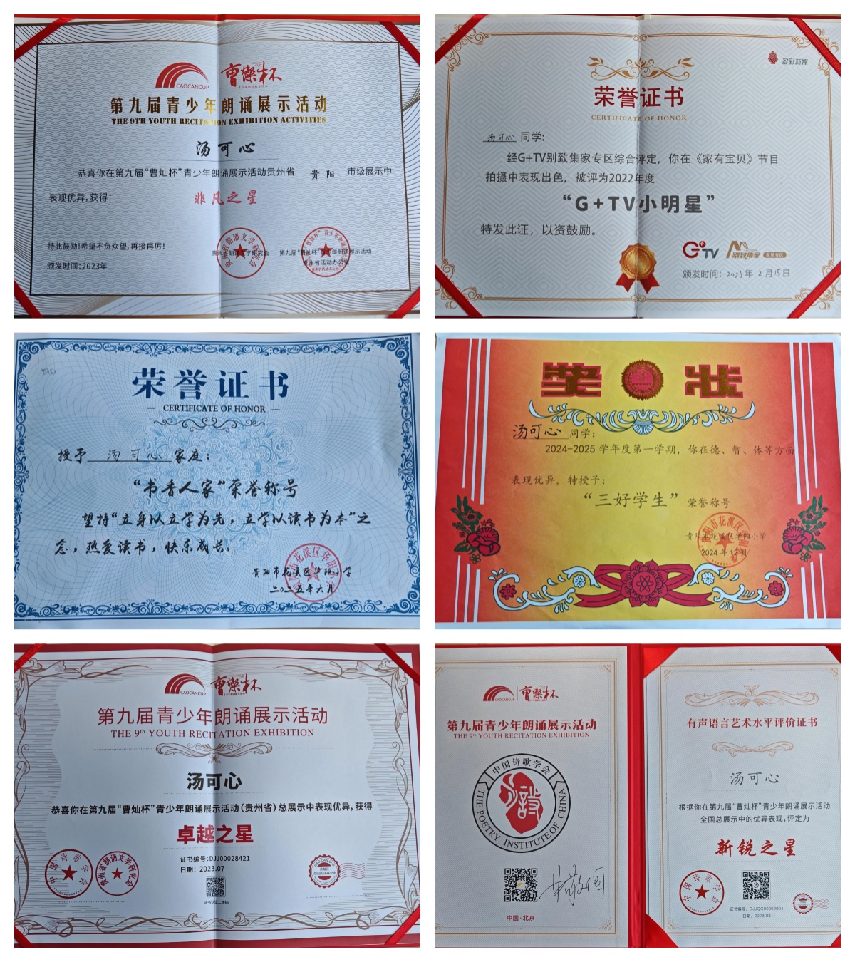 课余时间,我也积极通过比赛和活动锻炼自己:参加过曹灿杯第九届青少年朗诵展示活动,获评花溪区华阳小学区级“三好学生”,参与贵州电视台《快乐黔行》节目录制并播出,也曾登上多彩新媒《家有宝贝》G+TV小明星节目。